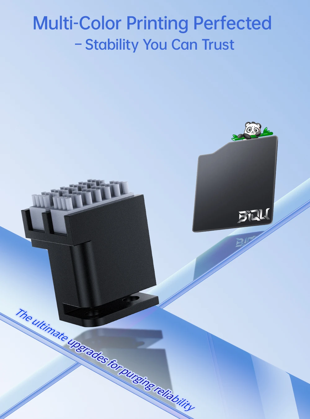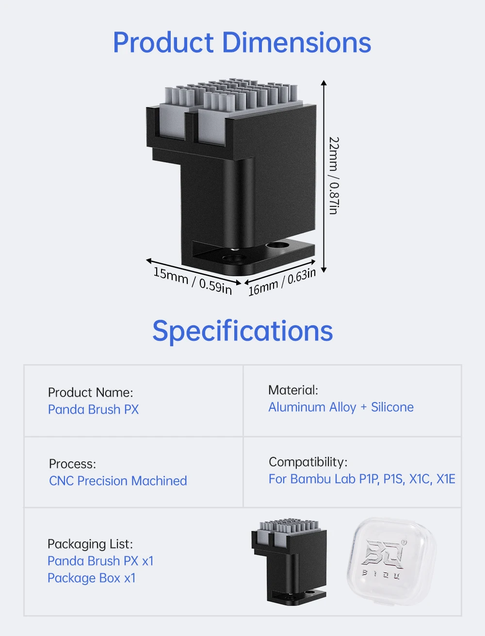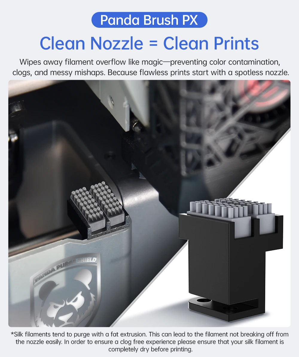 BIGTREETECH Panda Brush PX Panda Purge Shield Multi-Material Reliability Upgrades Nozzles Wiper Hotend Cleaner 3D Printer Parts For Bambu Lab P1 X1Multi-Material Reliability UpgradesNo Residue. No ClogsPanda Brush PXMaterial:Aluminum Alloy + SiliconeProcess:CNC Precision MachinedCompatibility:For Bambu Lab P1P, P1S, X1C, X1EClean Nozzle, Flawless PrintsEffectively wipes away overflow filament, preventing color contamination and ensuring smoother, cleaner results for flawless prints every time.To
