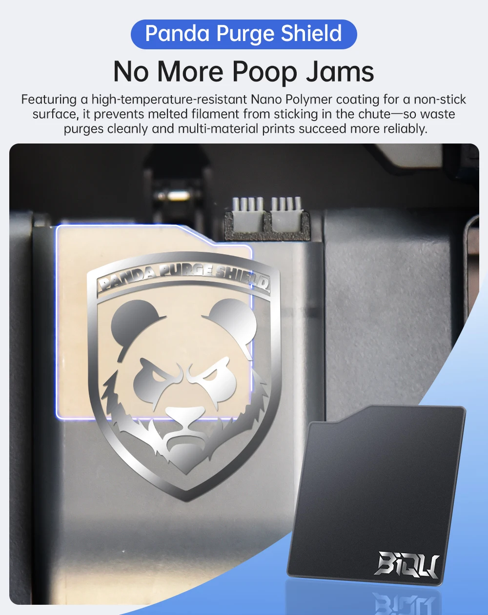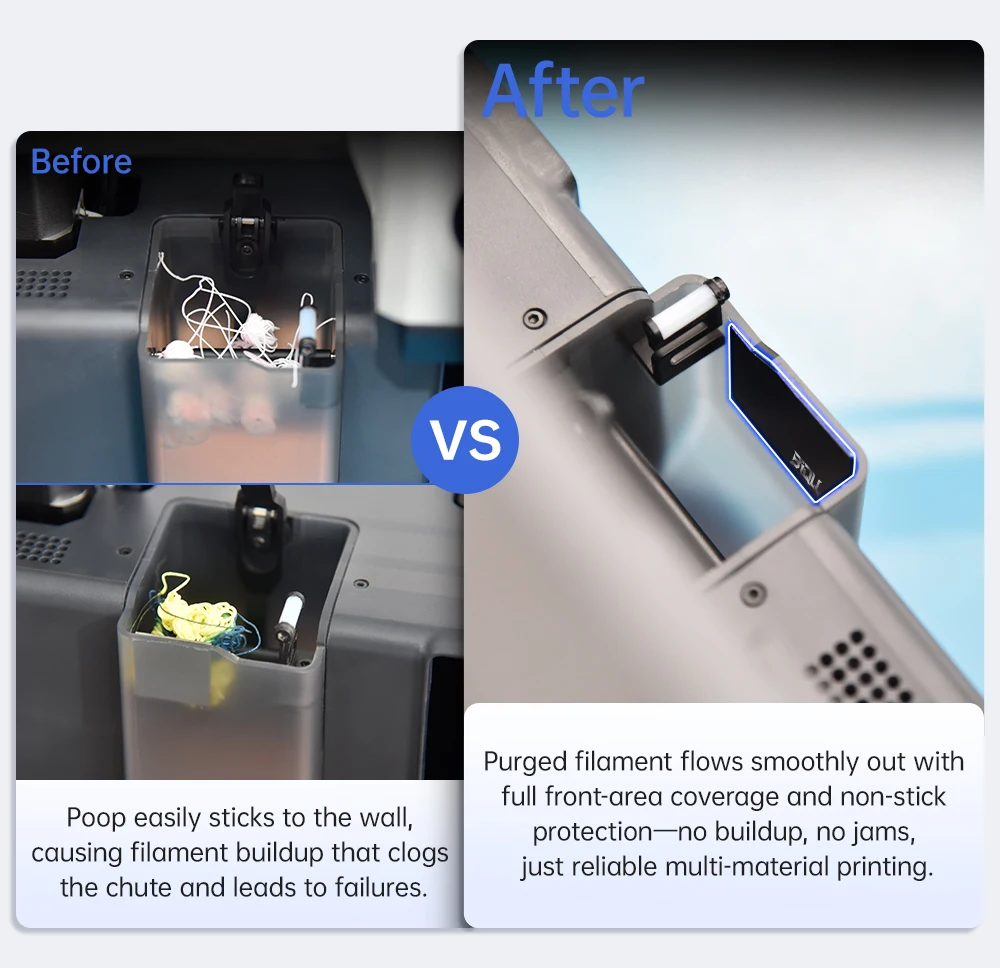 Featuring a high-temperature-resistant Nano Polymer coating for a non-stick surface, it prevents melted filament from sticking in the chute—so waste purges cleanly and multi-material prints succeed more reliably.