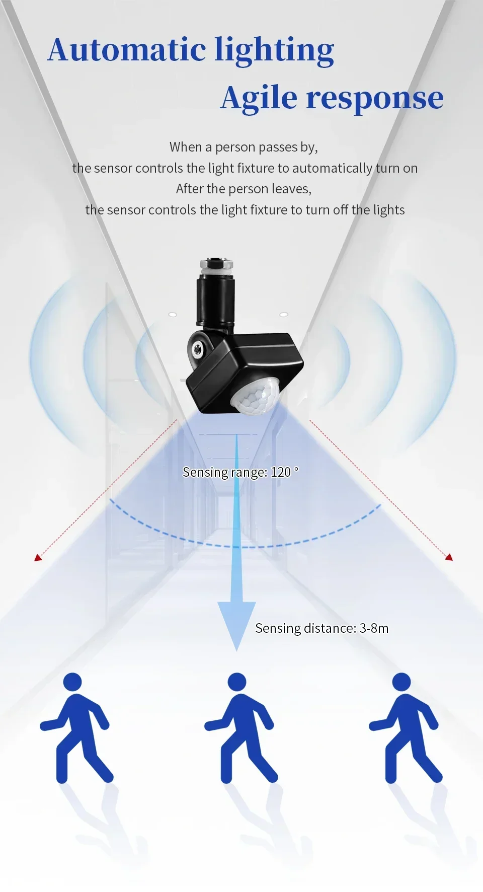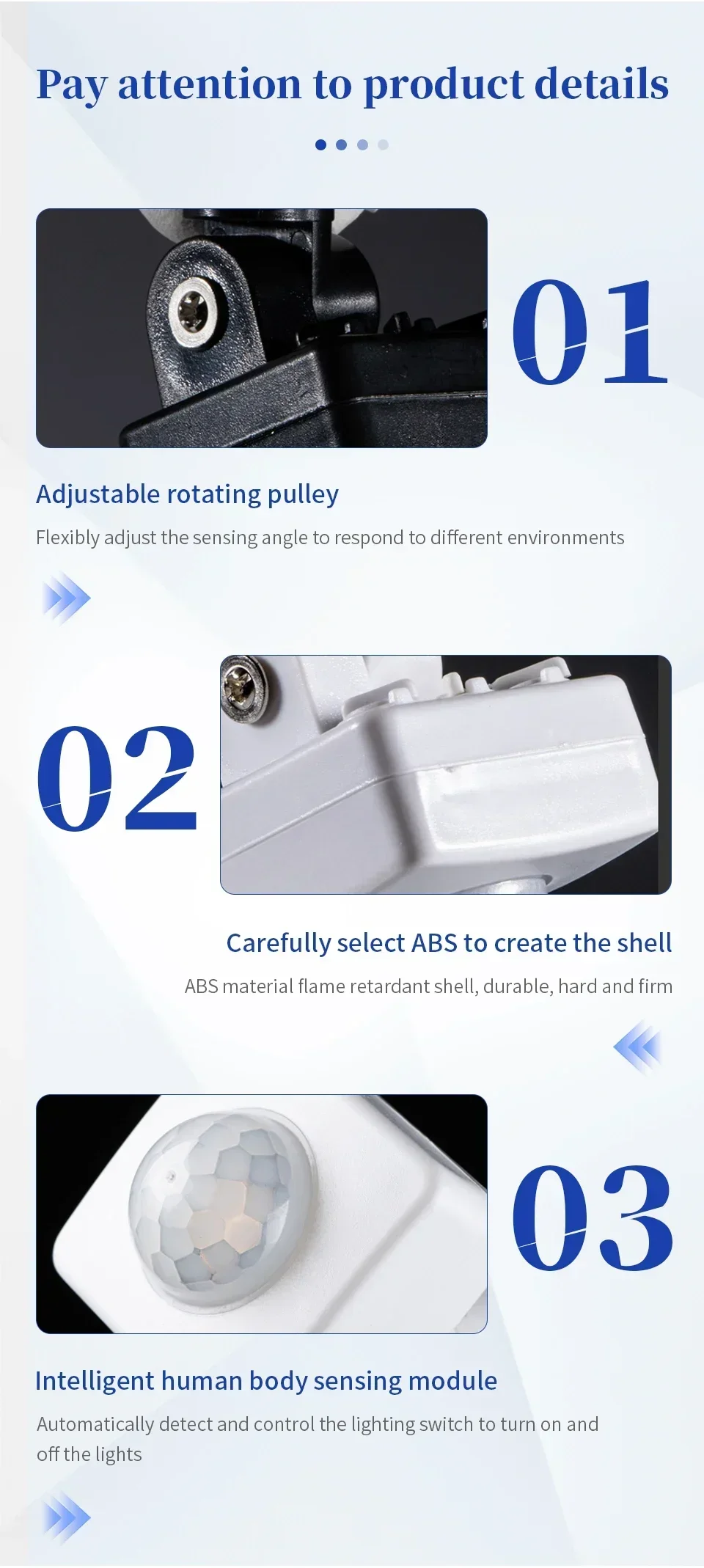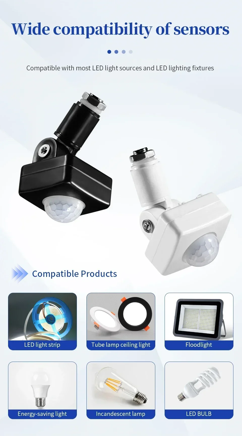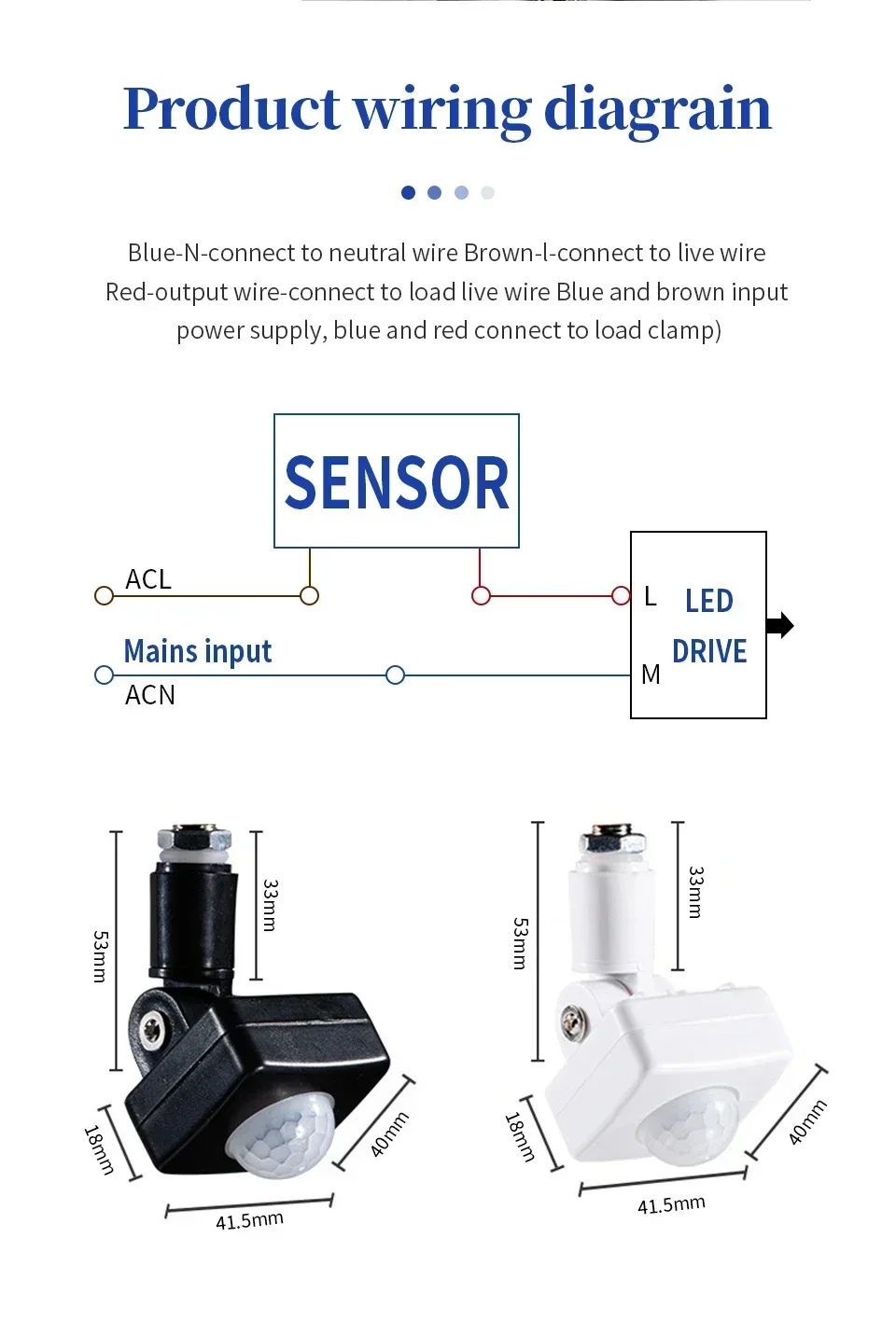 Specification:Detection range: 120 degreesDetection distance: 3-8M (25 degrees Celsius)Ambient lighting: 2-2000 LUX (adjustable)Working humidity: less than 93% RHMaterial: ABSInstallation method: open type (opening 10mm/12mm)Working voltage: AC110-240VDelay time: 10s (+/-5s) - 5 minutes (+/-1 minute)Working temperature: -10 degrees Celsius - 40 degrees CelsiusInstallation height: 1.8m-2.5mDimensions: 42*40*20mmFeatures:Brand New and High Quality!The 10mm open version of the interface is made of