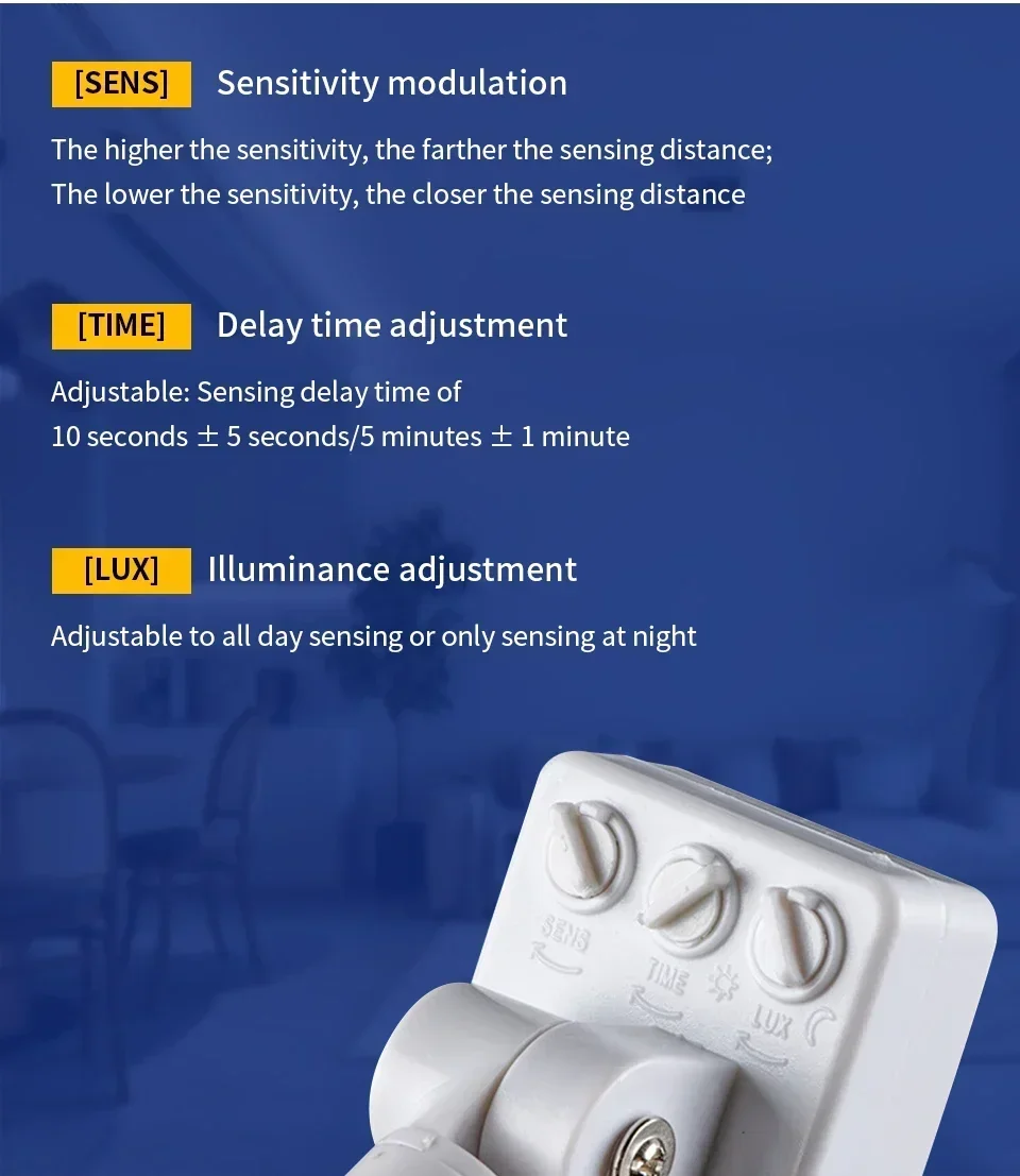 The delay time refers to the time when the sensor leaves the sensing area after the sensor senses the person and the sensor delays the time.