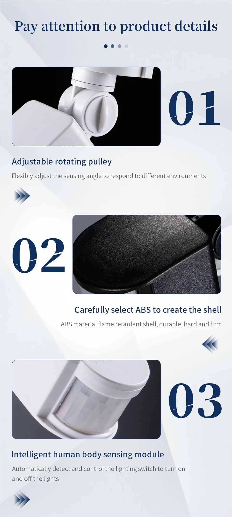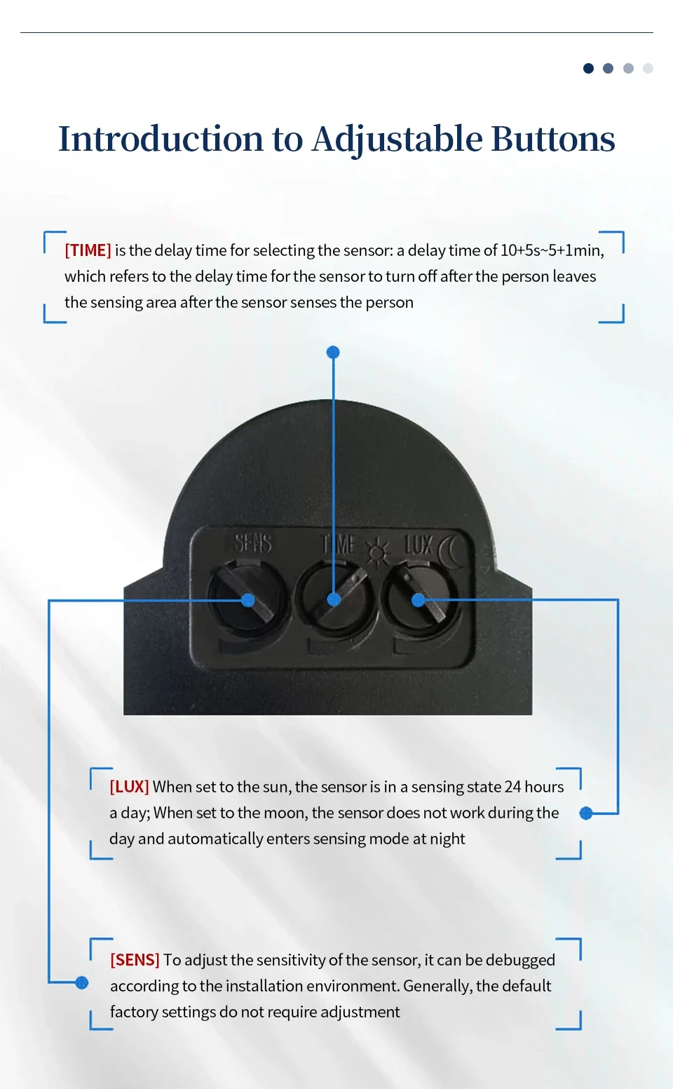 The smart products, increase the sensor sensitivity can be adjusted (using the SENS knob to adjust) function, increasing the sensor head can be up and down and left and right (up and down 90 degrees, about 160 degrees) can adjust the function, but also increased the induction angle. Product systemic waterproof, can be used indoors and outdoors.