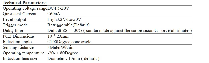 Features:■Automatic induction : to enter the sensing range of the output high, people left the sensing range automatic delay off high , output low.■ ultra-small size .■ repeatable trigger: the sensor output high , the delay period , if there is human activity in its sensing range , the output will remain high until the people left after the delay will be high goes low ( it will be automatically extended after sensing module detects the human body every activity a delay period of time , and with