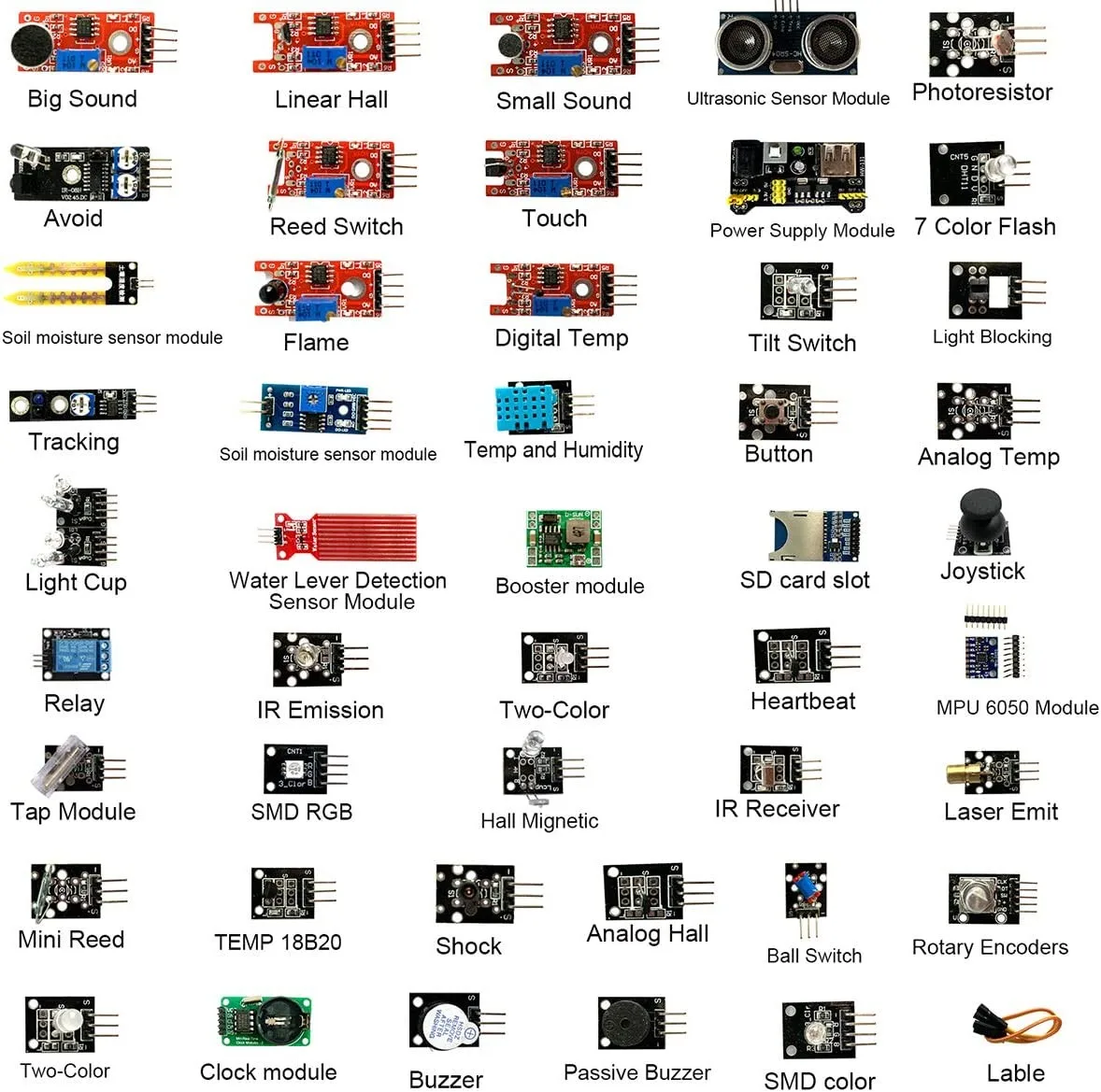 16 Kinds Sensor Description:DHT11 temperature and humidity module sensorHC-SR501 human body infrared sensor moduleDS1302 real-time clock module without batteryRaindrop sensorSound sensor moduleHC-SR04 ultrasonic sensorFlame sensor moduleLaser head sensor modulePhotoresistor sensor moduleSoil moisture sensorObstacle avoidance sensorShock sensor moduleMQ-2 gas sensor module433M wireless transceiver moduleTilt sensor moduleTracking module45 Kinds Sensor Description: 1 x Soil module1 x Infrared se