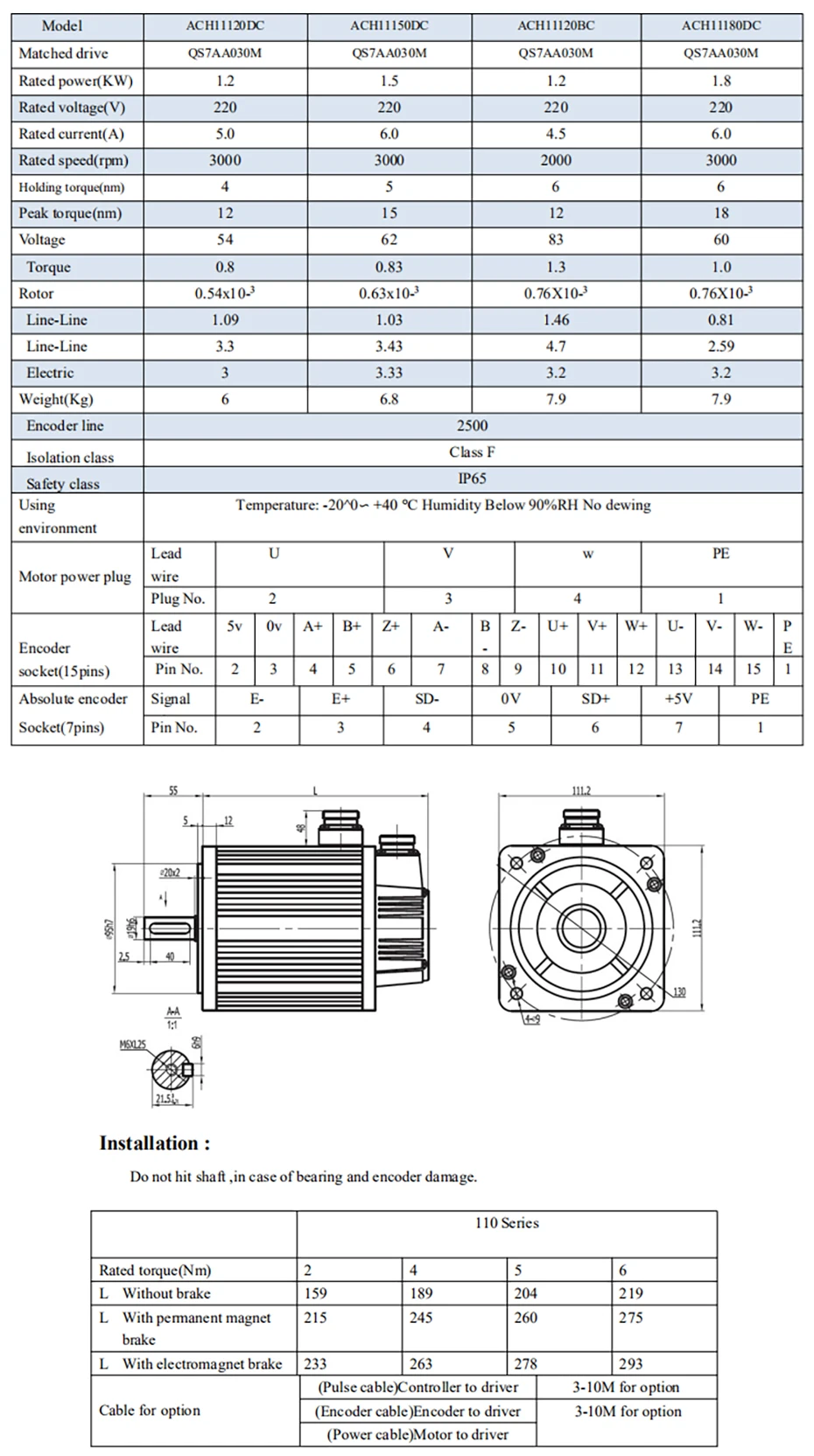 1 Pcs ACH11120DC motor + 1 Pcs QS7AA030M Driver + 1 Set 3 Meters Servo Cable (Encoder and power cable)