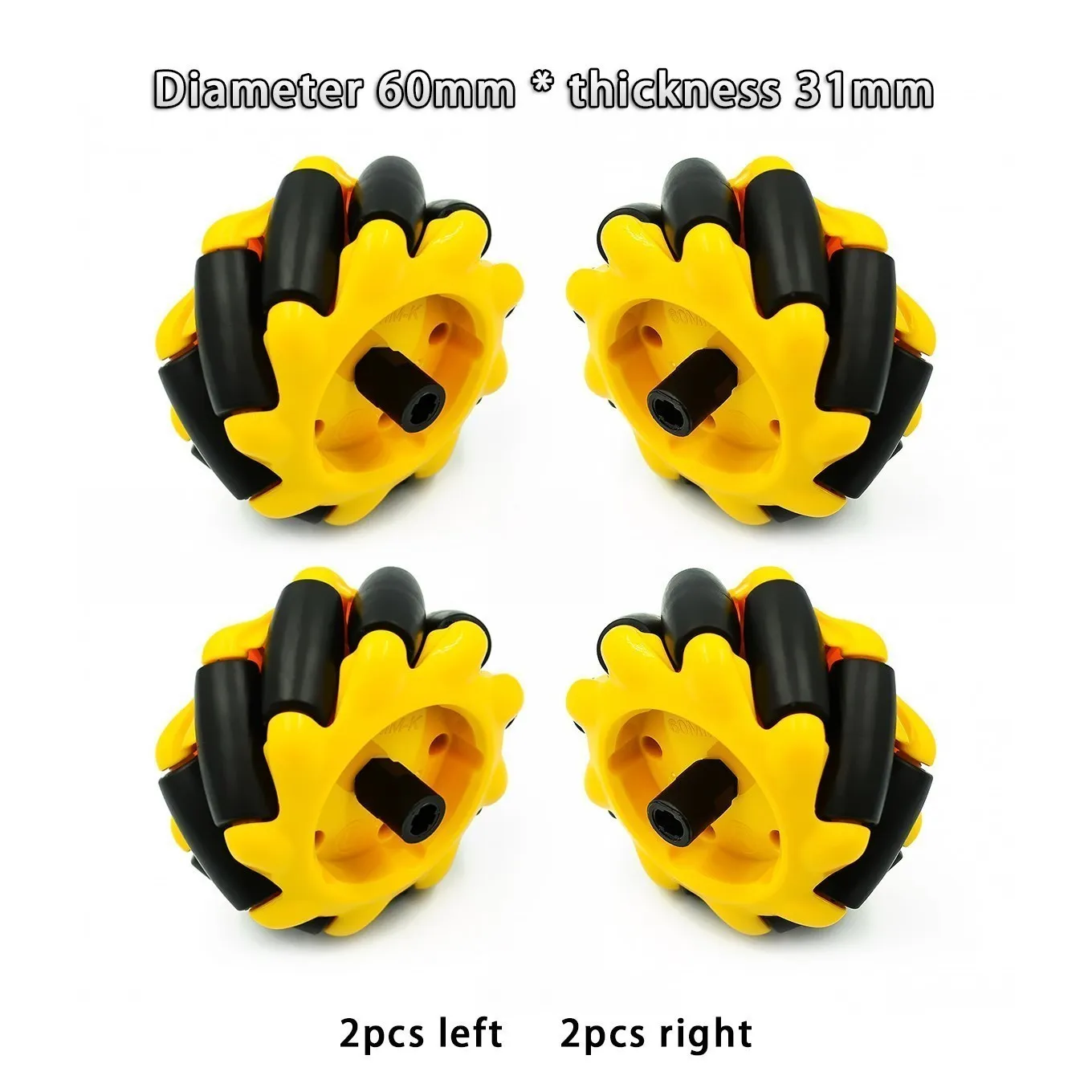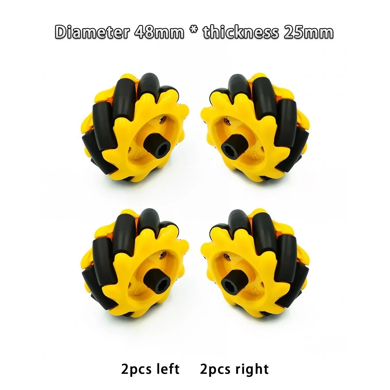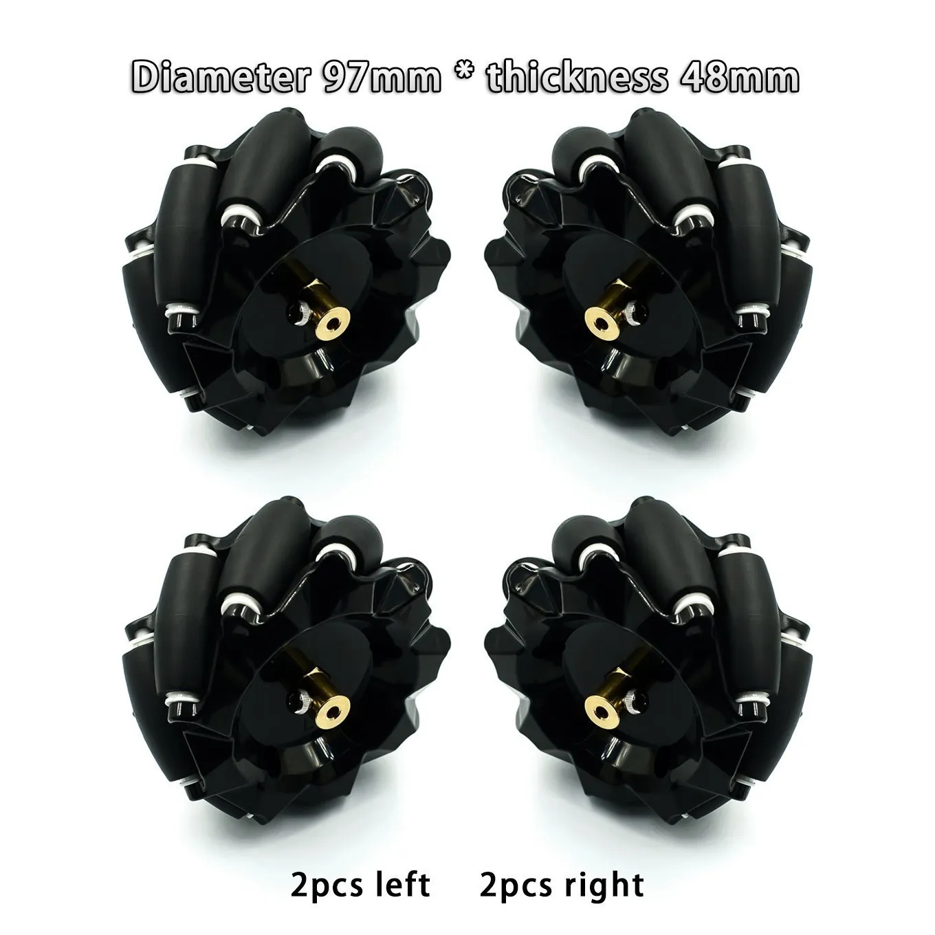 Black wheel: diameter 97mm, thickness 48mm. Coupling diameter 12mm, internal hole 4mm.Package list:2pcs left mecanum wheel 2pcs right mecanum wheel