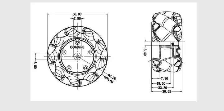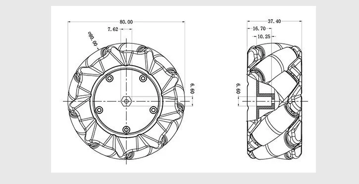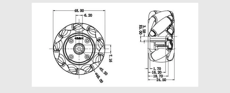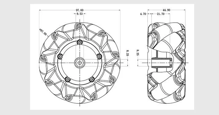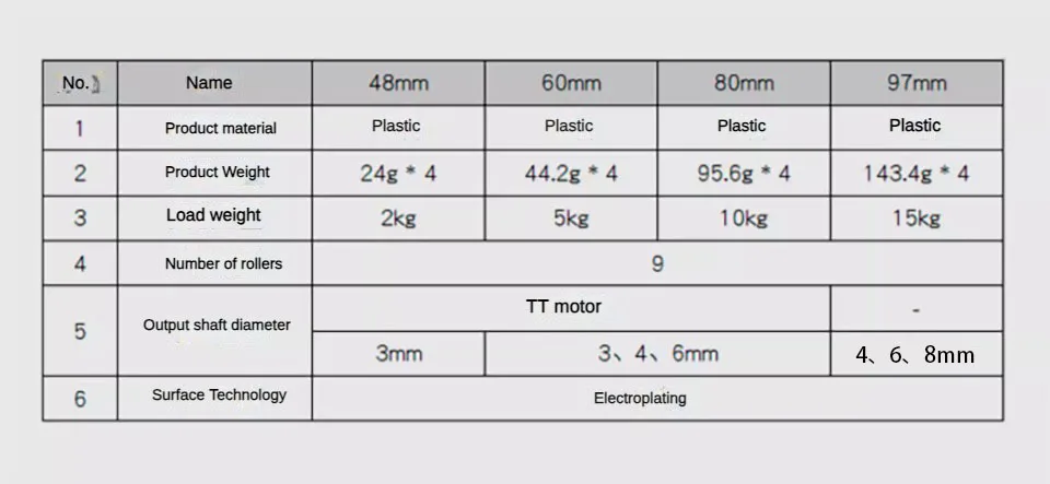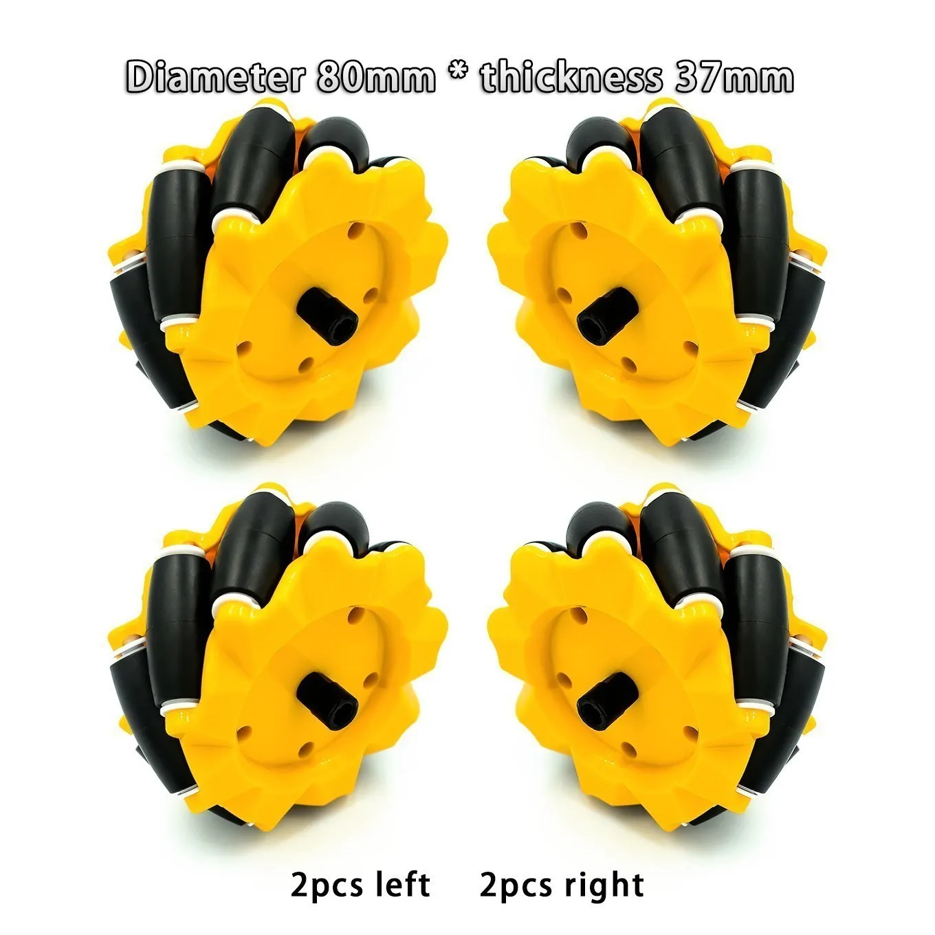 Black wheel: diameter 97mm, thickness 48mm. Coupling diameter 12mm, internal hole 4mm.Package list:2pcs left mecanum wheel 2pcs right mecanum wheel