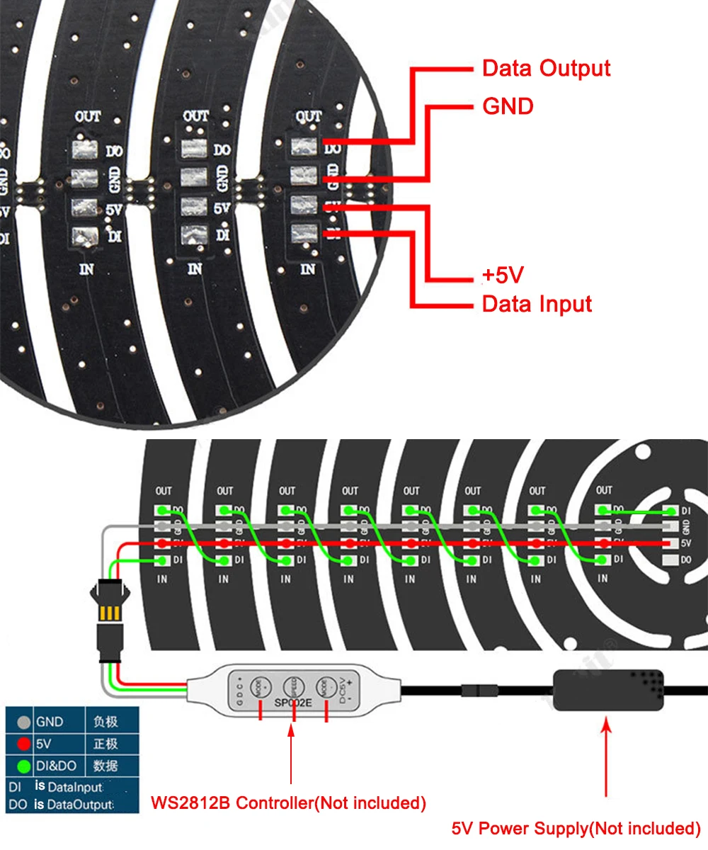 The control circuit and the LED share the only power source. Control circuit and RGB chip are integrated in a package of 5050 components, form a complete control of pixel point.