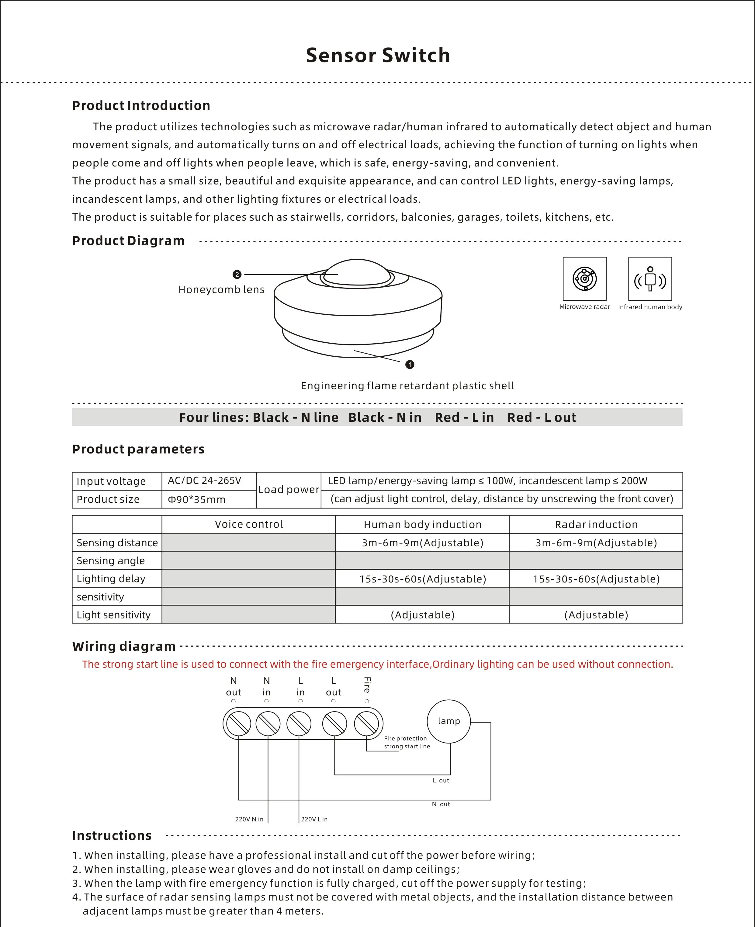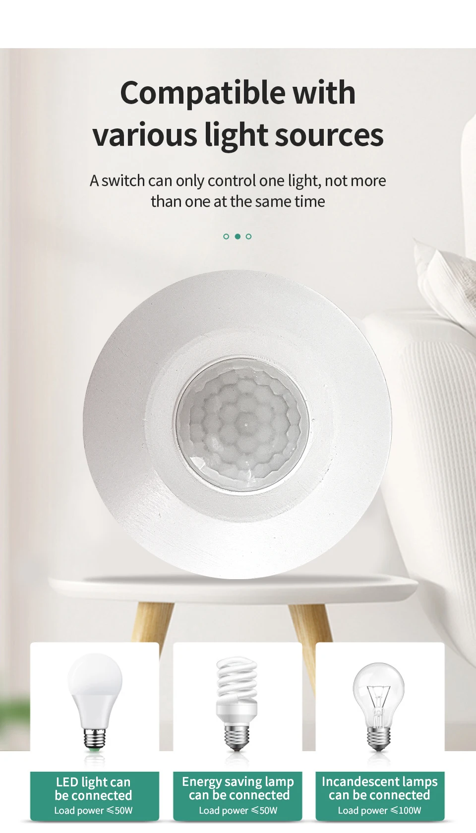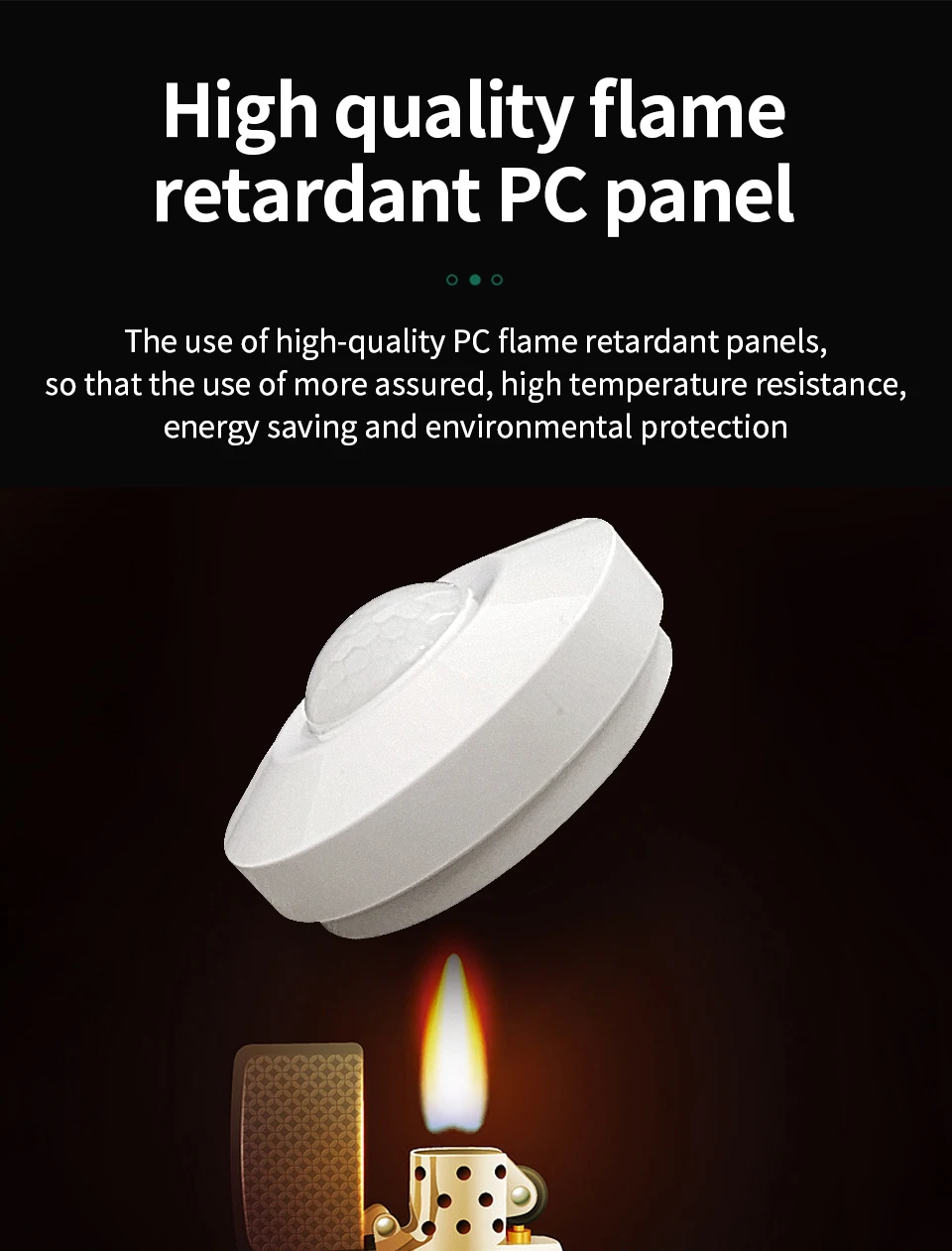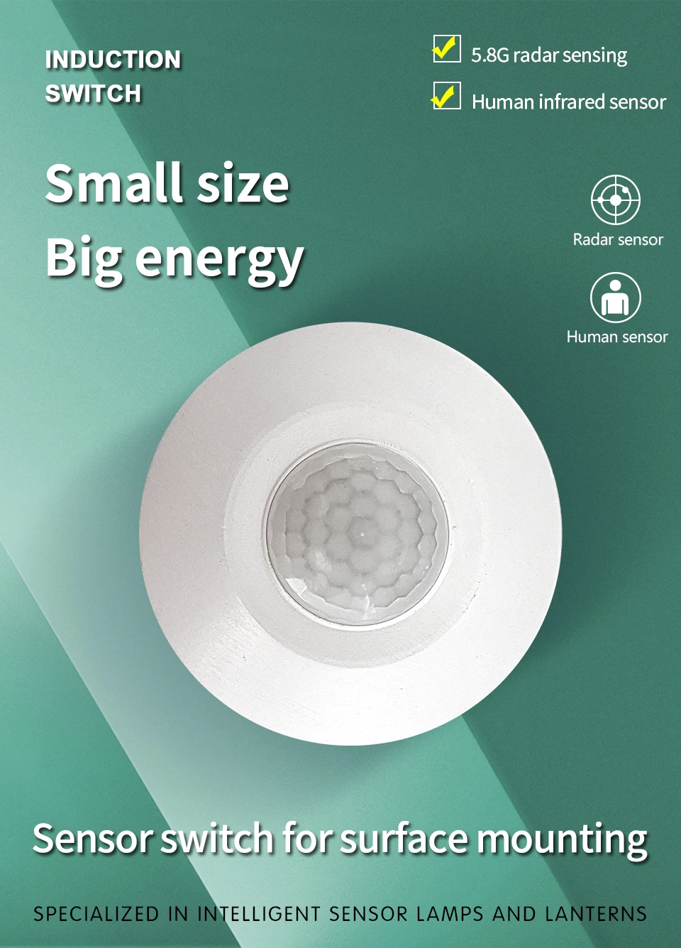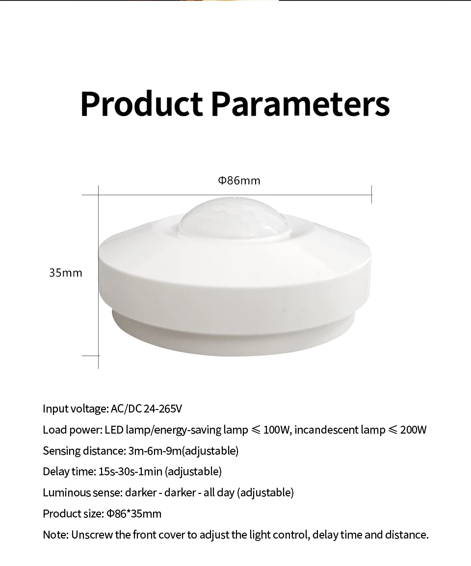 • High Sensitivity Sensor :The AC/DC24-265V Pir super slim motion sensor light switch uses a high-sensitivity infrared detector, ensuring accurate human body detection within a 360-degree range.• Slim Design :Designed for ceiling mounting, this super slim motion sensor light switch is compact and unobtrusive, making it ideal for any room decor.• Versatile Application :Whether it's for residential or commercial use, this motion sensor light switch provides reliable performance in various env