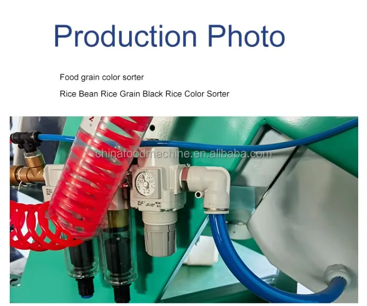 The material enters the machine from the hopper at the top, and through the vibration of the vibrator device, the material slidesdown the channel, accelerates down into the observation area of the sorting room, and passes through the sensor and the background plate. Under the action of the light source, according to the strength of light and color changes, the system produces output signal to drive the solenoid valve to blow out the color particles to the hopper waste cavity, and the good selected material continues to fall to the hopper finished product cavity, so as to achieve other purposes.