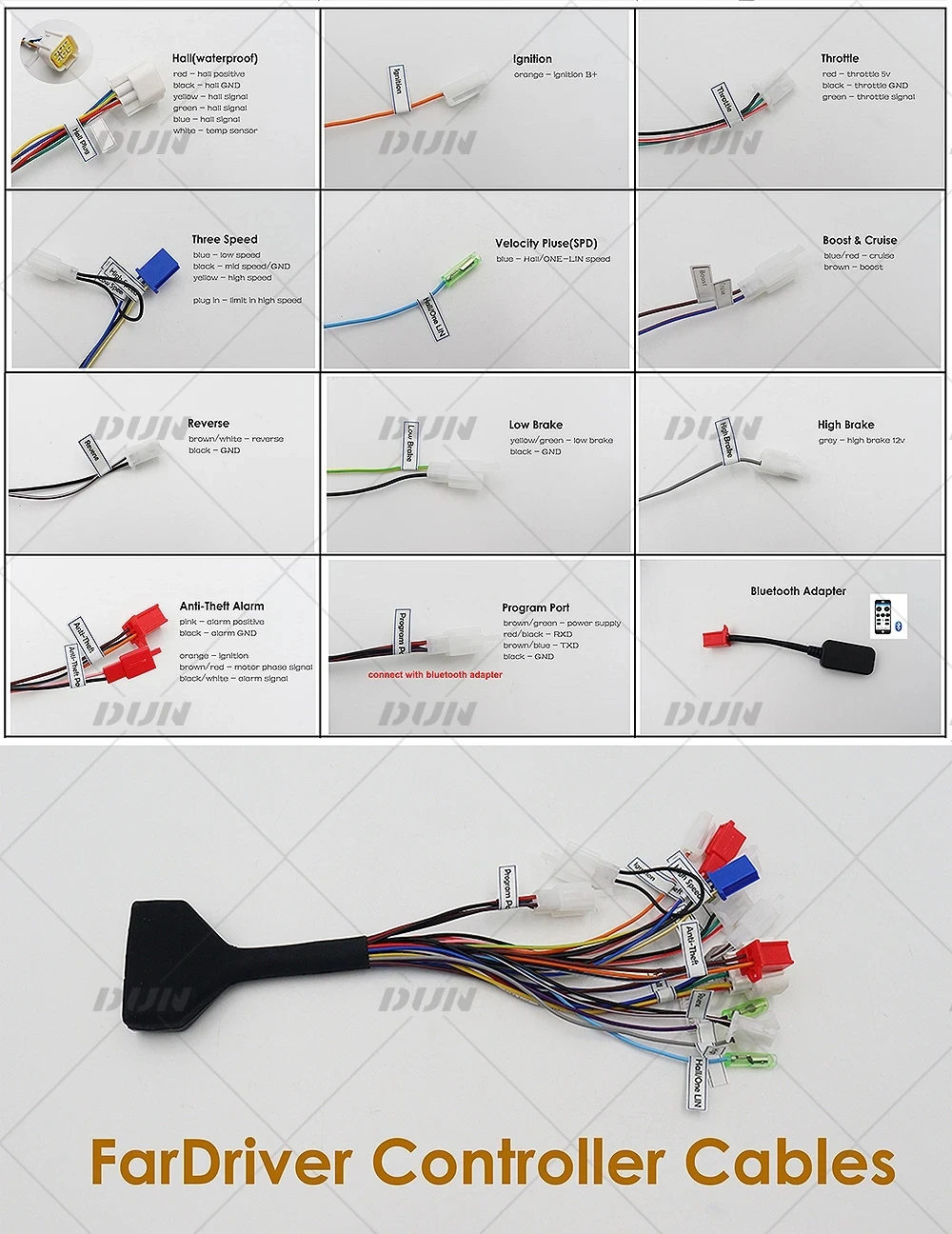Fardriver ND72530 350A Sine Wave BLDC Hall Sensor Controller with N7 Display and Throttle Kits for 4000W-6000W MotorThe default function for Fardriver controller :Hall plug, Throttle signal (0-5V), Ignition, Speed Signal Meter, High Brake(12v), Three Speed, Temp Sensor, Reverse, Low Brake(0v),Flux Weakening,Anti-Theft,Boost,Cruise,Self Learning,Program Port.-One Kit Contains-1 pcs x Fardriver ND72530 Controller1 pcs x Bluetooth1pcs x T08 Throttle1pcs x N7 display1 pcs x Manuals & Software L