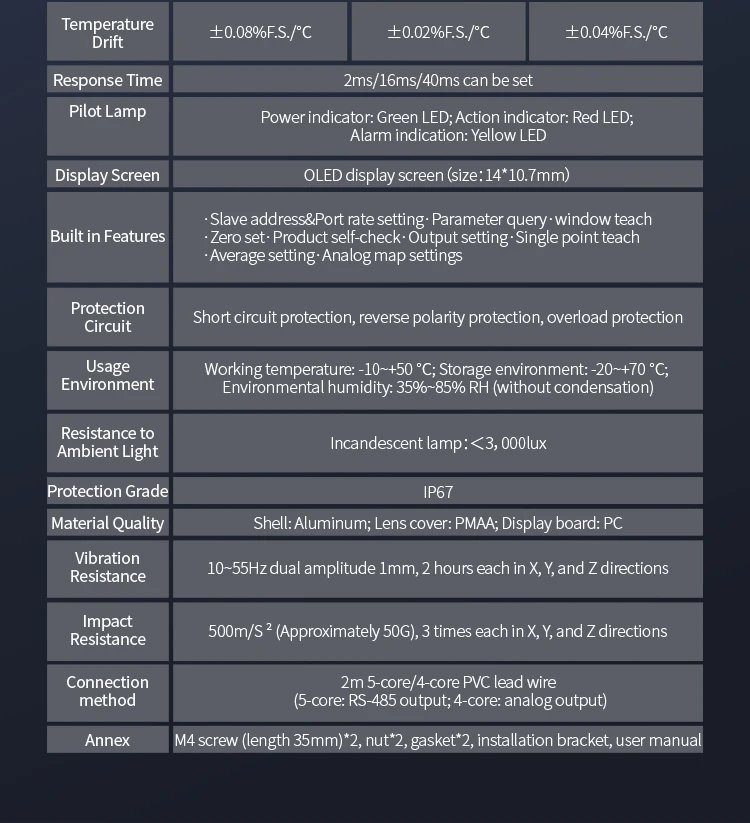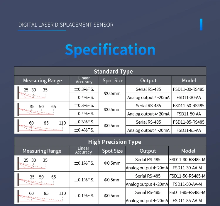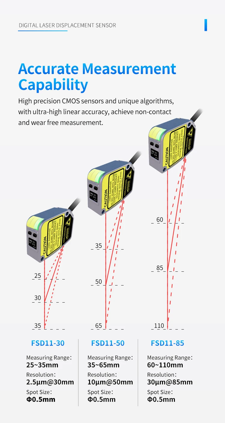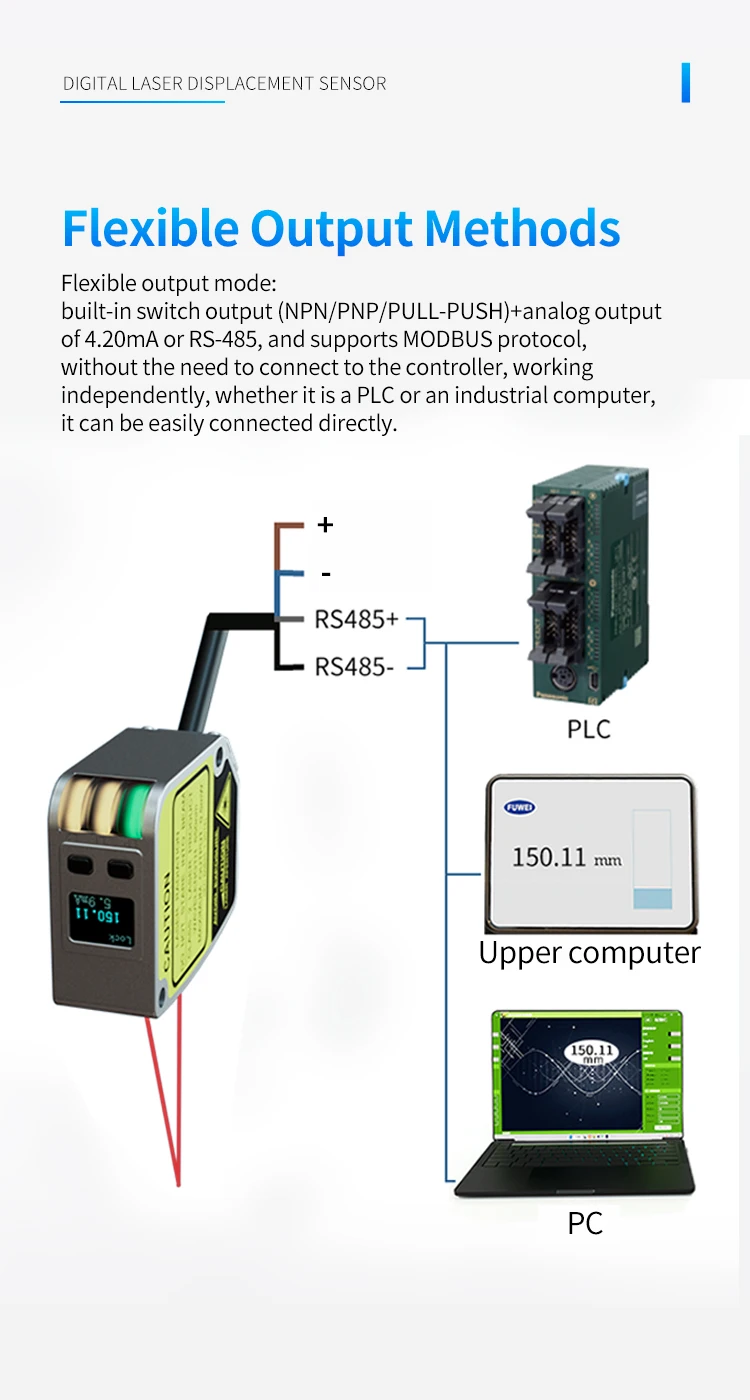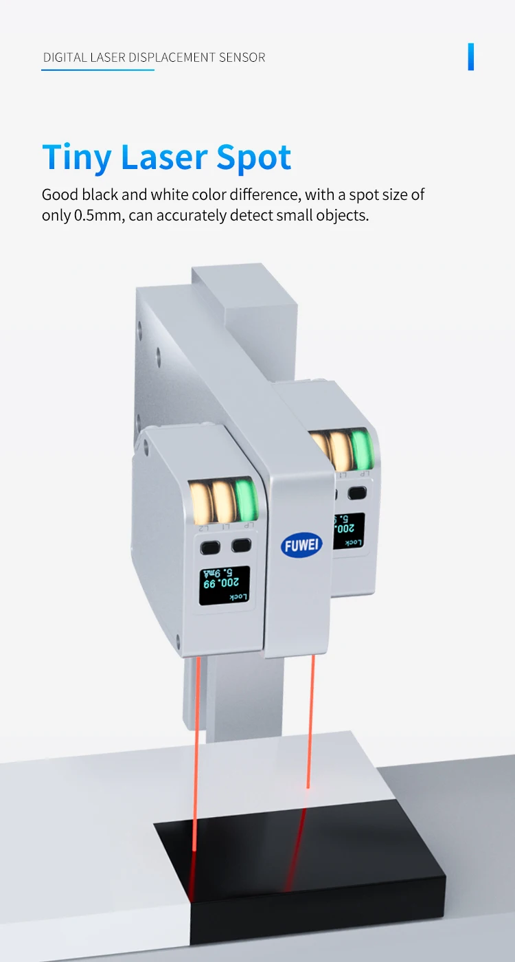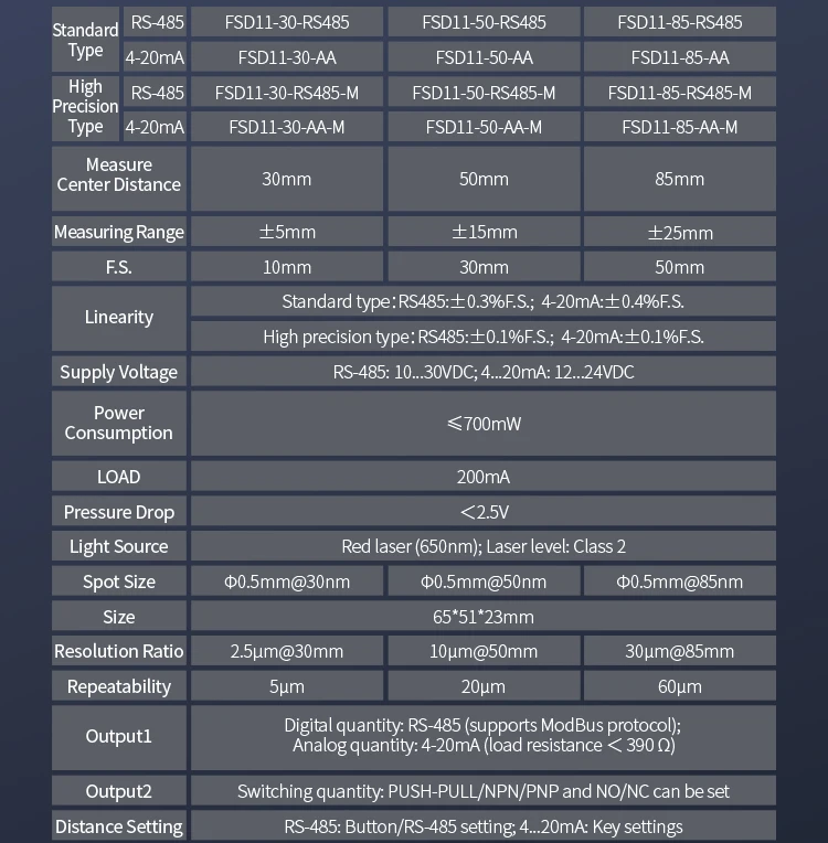 FSD11-30-RS485-M high precision digital display measuring thickness flatness ModBus laser displacement distance measuring sensor Product sellpointsOptical Sensor Technology:Utilizes optical sensor technology for reliable and consistent measurements.Analog Output:Offers both 4...20mA and analog sensor outputs, ensuring compatibility with various control systems.Digital Communication:Equipped with ModBus RTU, this sensor facilitates seamless integration with digital systems.Fuwei Flr 100 Rs485|Fu