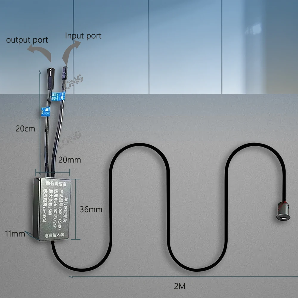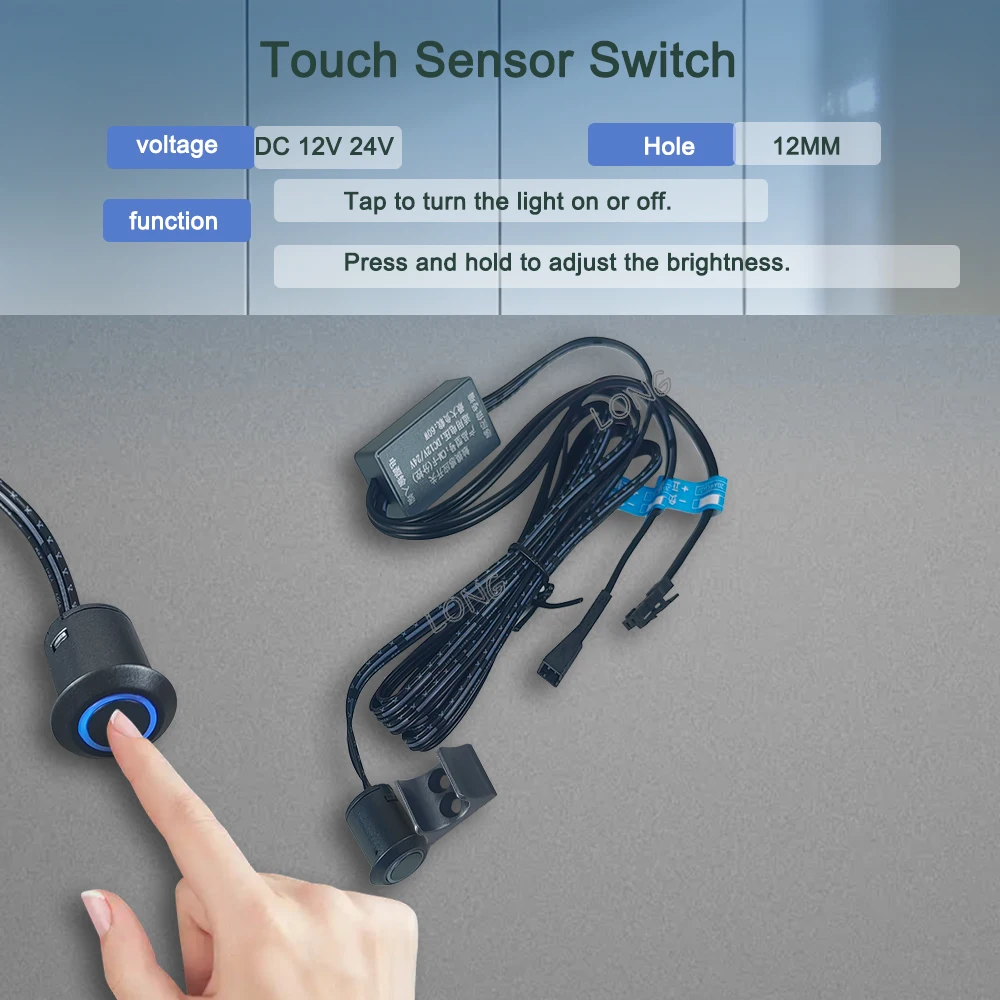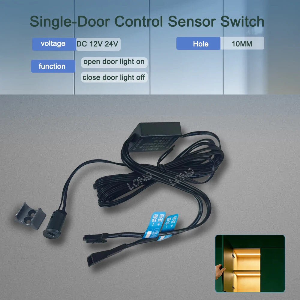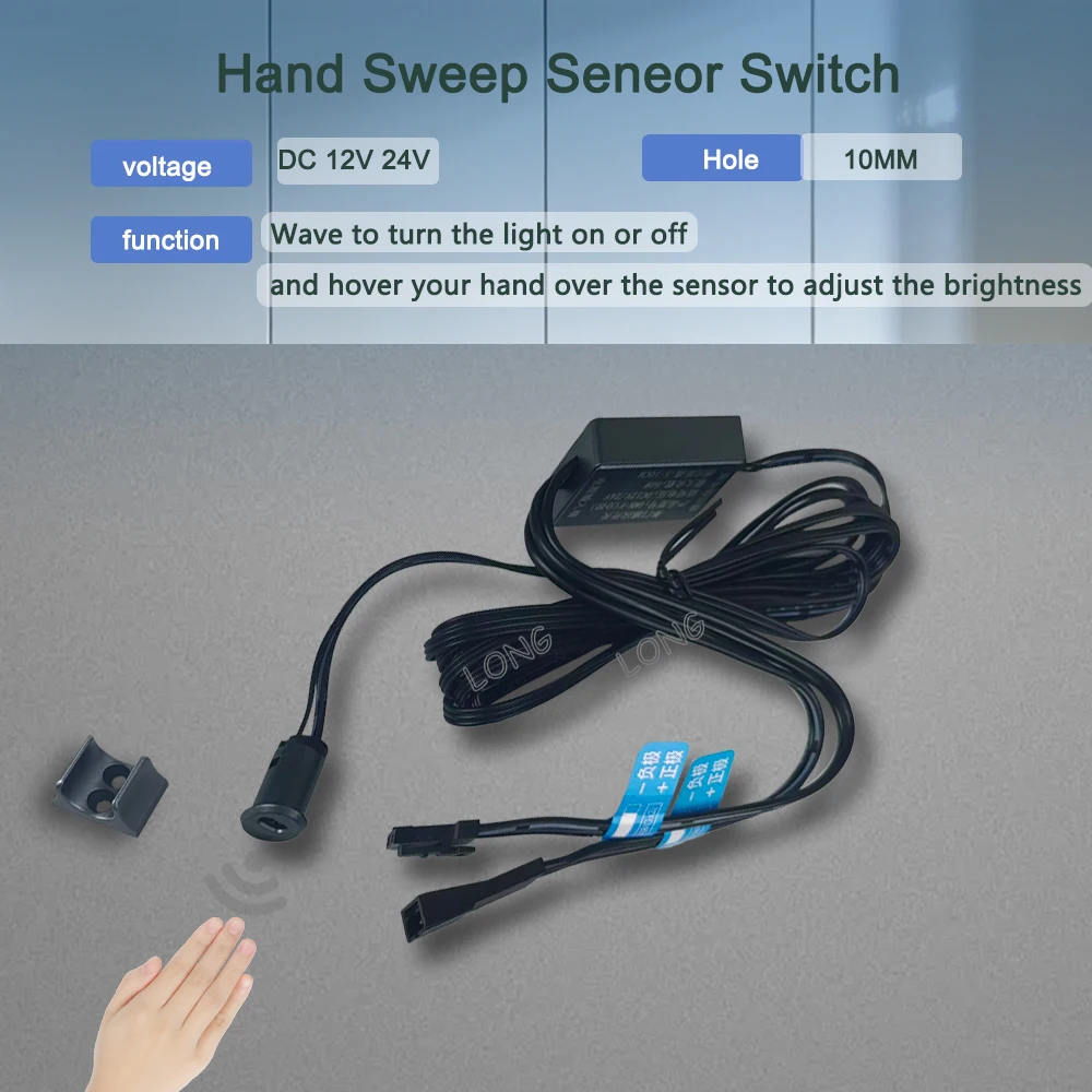 Hand sweep sensor Switch■Working voltage:12V-24V DC■Rated Current:5A■Rated Power:≤60W■Sensing distance:5-10cm■Function: Sweep Wave your hand to turn on the light,then wave your hand to turn off the light.Long press to continuously adjust the brightness6. Hole:10mmSingle-door Sensor Switch■Working voltage:12V-24V DC■Rated Current:5A■Rated Power:≤60W■Function: The door opening light is on, the door closing light is off■If need open hole:10mmTouch Sensor Switch■Working voltage:12V-24V DC■Rated Curr