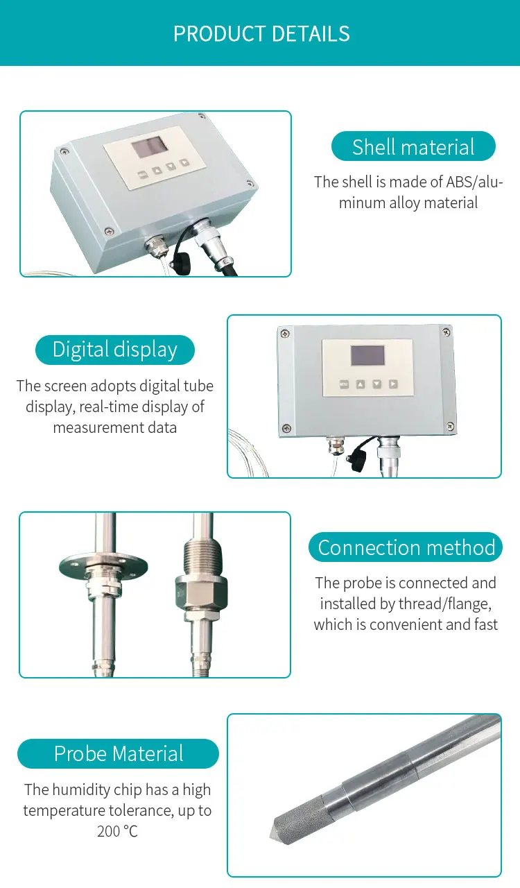 Product DescriptionMeasuring range-40~200℃Measurement accuracy±0.2℃Repeatability±0.1℃Long term stability<0.04℃Response time30sSupply voltage24V DC±10%Current consumptionMax 80mAElectrical connectionsTerminalsShell materialABS/Aluminum alloyDisplay operating temperature-40~70℃Display methodDigital TubeLine lengthStandard 2 meters, maximum customized 6 meters