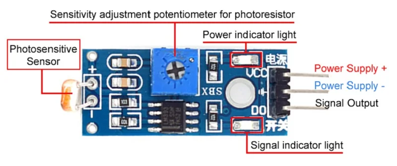 When the light intensity is below the module's sensitivity threshold, the sensitivity indicator light will turn off and the signal port will output a high level; When the light intensity is higher than the module's sensitivity threshold, the sensitivity indicator light will turn on and the signal port will output a low level.