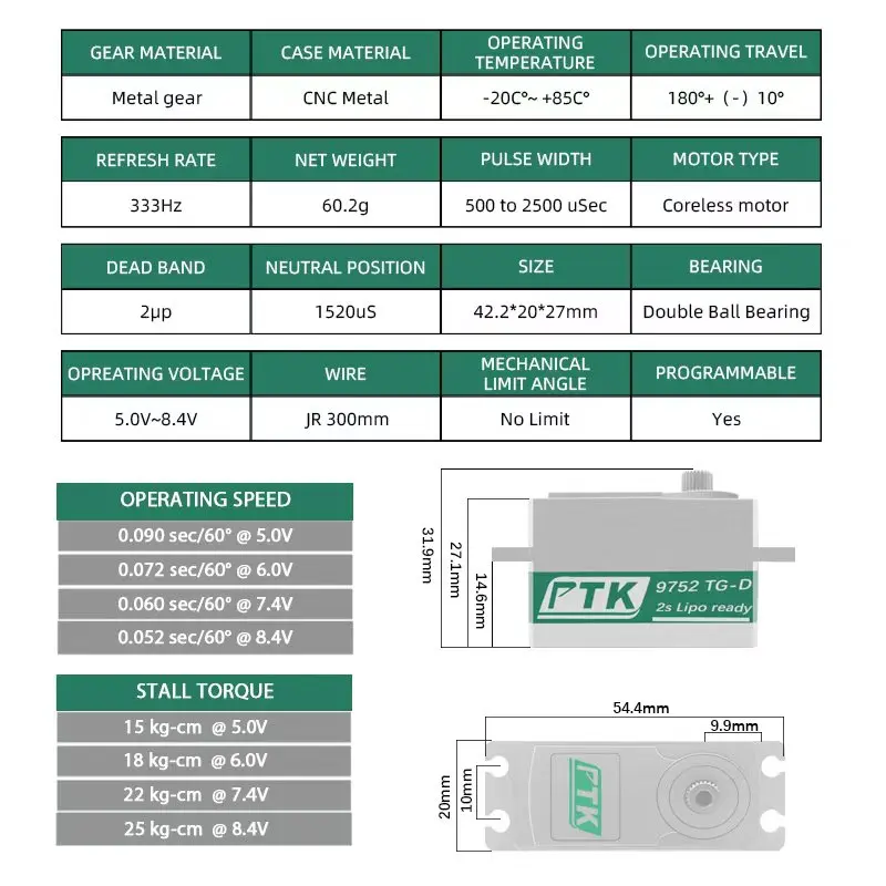 Outstanding performance, stable and reliable. Apart from the upgrade in appearance, the PTK 9752 compact steering gear also performs exceptionally well in terms of performance.It is particularly worth mentioning that this servo can respond quickly and accurately to various control signals, adding: SR, SHR, SFR, SXR, SSR