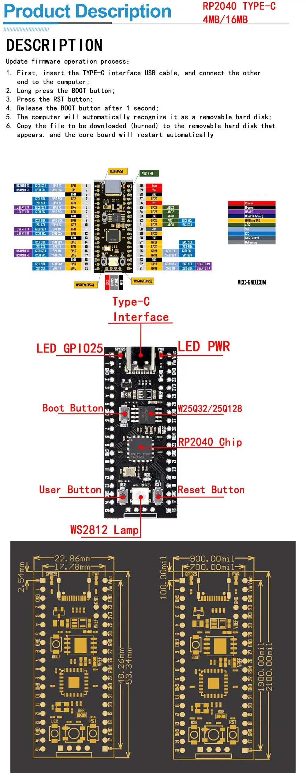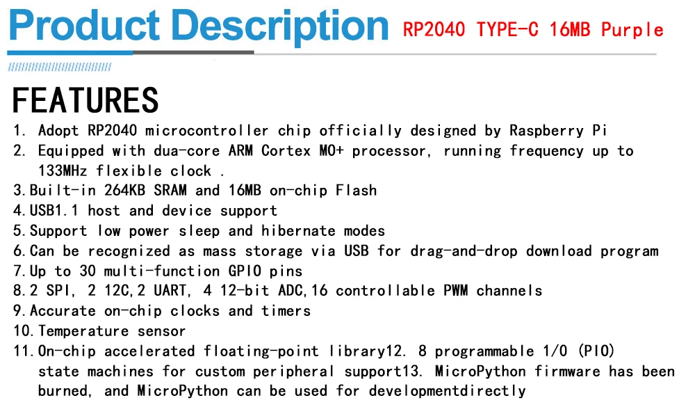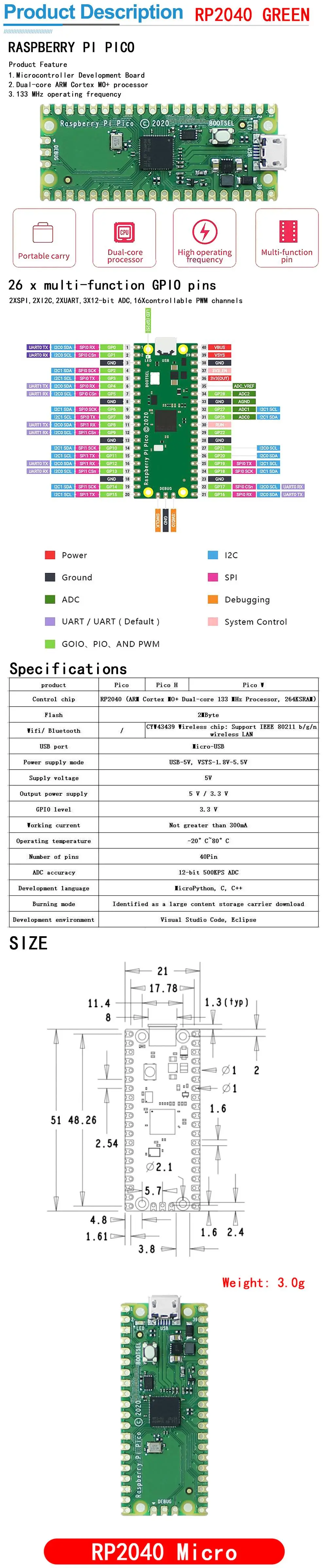 Raspberry Pi Pico Board RP2040 Dual-Core 264KB ARM Low-Power Microcomputers High-Performance Cortex-M0+ Processor