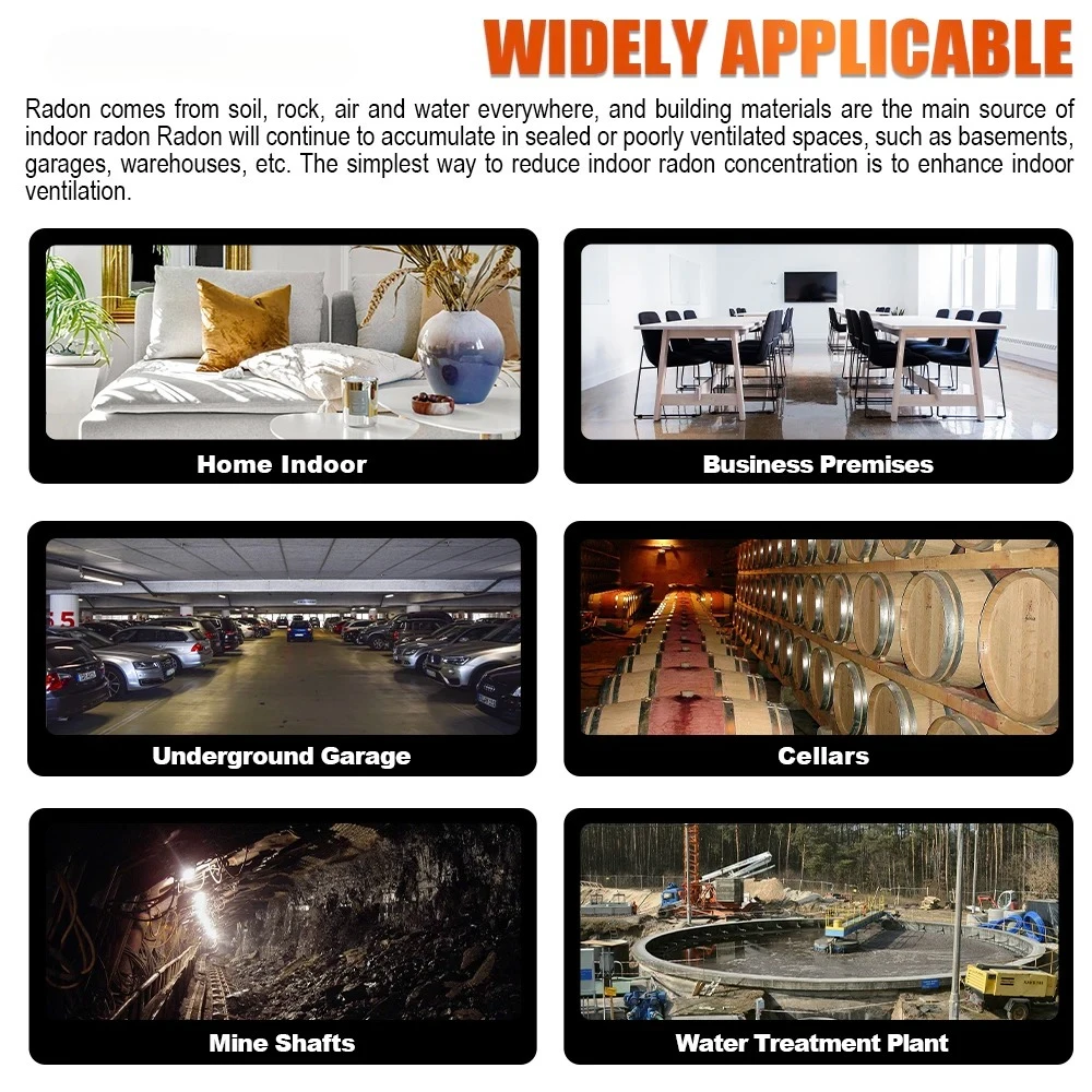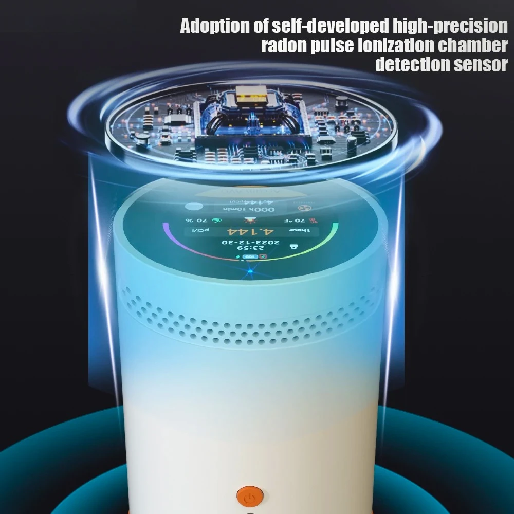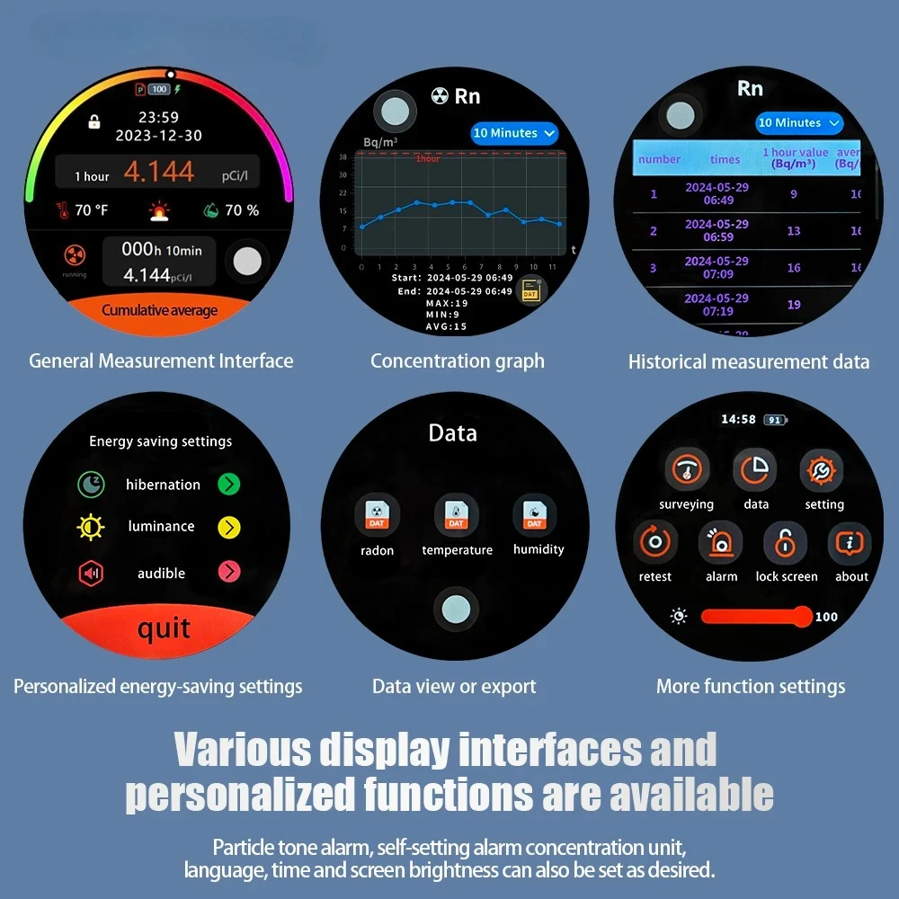 Radon concentration alarm threshold and alpha particle tone can be set, and sound switch can be controlled.