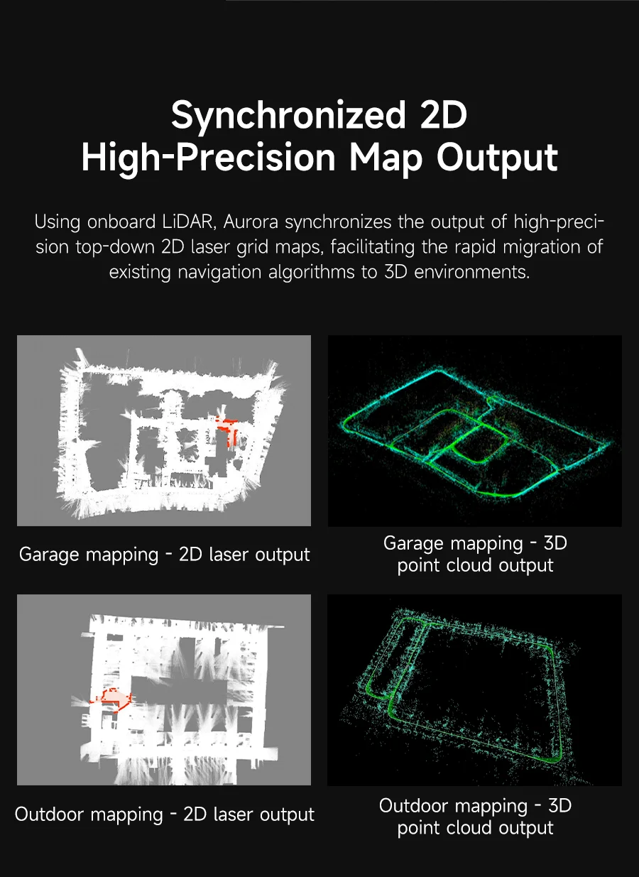Aurora is an integrated positioning and mapping sensor that integrates LiDAR, binocular vision, inertial navigation (IMU) and AI deep learning technology, with highly integrated 3D perception capabilities. Aurora can achieve high-precision indoor and outdoor 3D mapping as soon as it is turned on, without external dependencies, supports 6 DOF positioning, and is suitable for a variety of scenarios, such as multi-story building mapping and large-scale space mapping. We provide detailed tutorial materials, including graphical interactive software RoboStudio and SDK for secondary development, can help users expand different application projects.