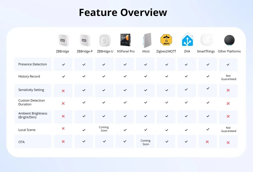 SONOFF SNZB-06P is compatible with multiple Zigbee hubs, such as SONOFF NSPanel Pro, SONOFF iHost, SONOFF ZB Bridge Pro, SONOFF ZBDongle-E, SONOFF ZBDongle-P and Echo Plus 2nd...expanding the possibilities for your home automation system. *For optimal compatibility, SONOFF SNZB-06P may appear as a motion sensor on certain platforms, but it retains the functionality of a human presence sensor.