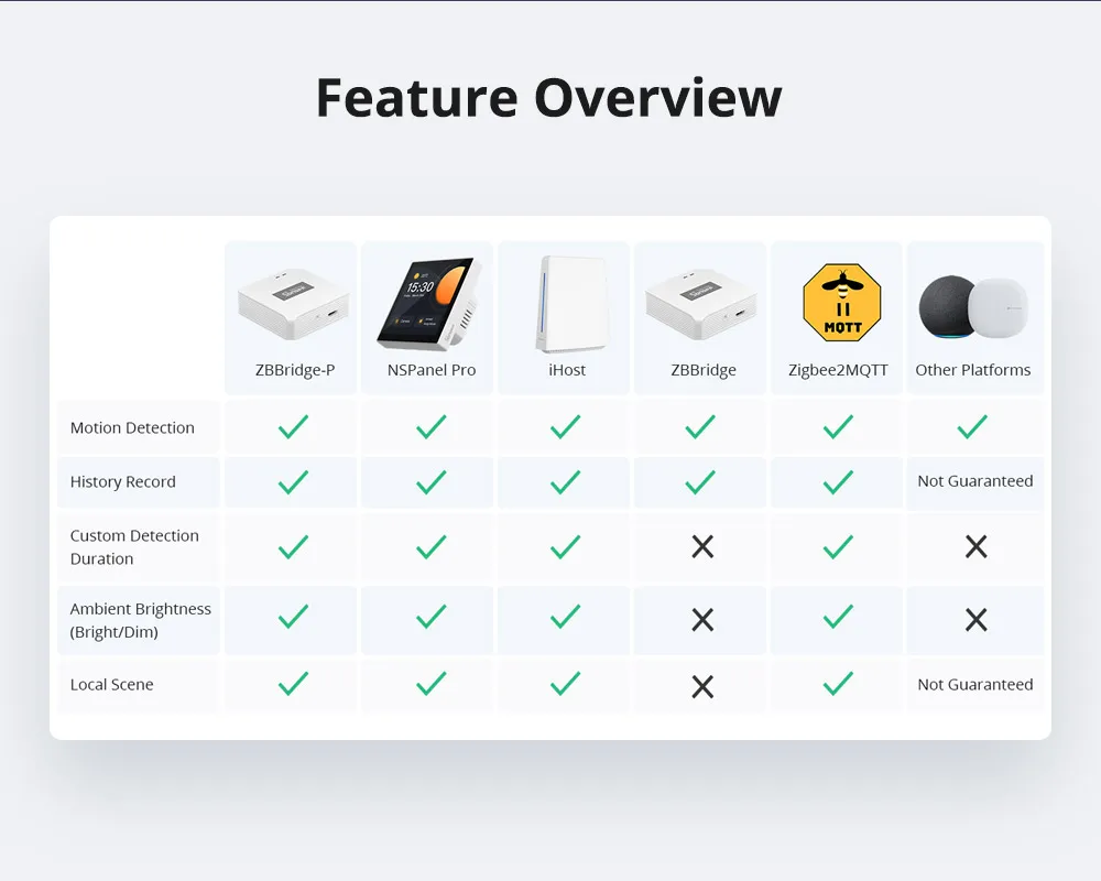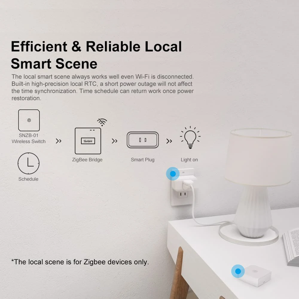 SONOFF Zigbee Bridge Pro newly added features like smart home security, local smart scene, and easy arm and disarm. You can customize 3 modes by setting different arming devices. The local smart scene always works well even Wi-Fi is disconnected. Built-in high-precision local RTC, a short power outage will not affect the time synchronization. Time schedule can return work once power restoration. Note that the local scene is for Zigbee devices only.