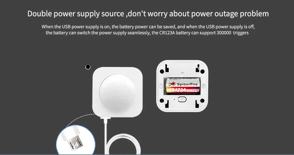 -Either 5v type-c or battery could be power in, if usb power in, the battery will be backup, no any consume, even if no usb power, the battery can be used for 3years at least (the duration may vary depending on the usage environment) and support low battery alarm