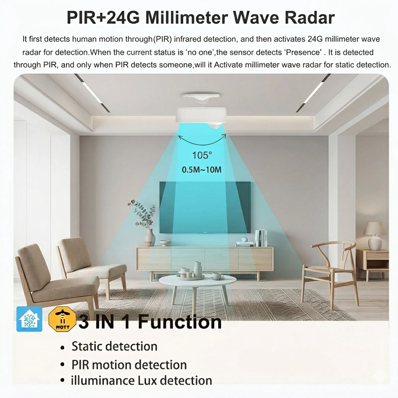 (855) I-BUY-ROBO (855) 428-9762ZigBee Human Presence Sensor 24G MmWave Radar PIR Motion Sensor,Luminance Distance Detection,For Home Assistant Zigbee2MQTT