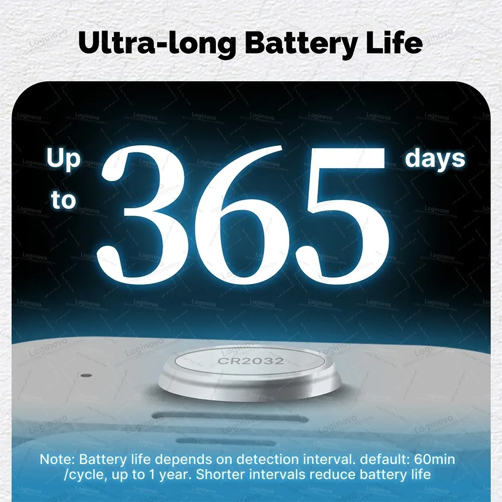 • Long-Lasting Battery: CR2032 battery lasts up to 360 days (at 60-minute detection intervals)