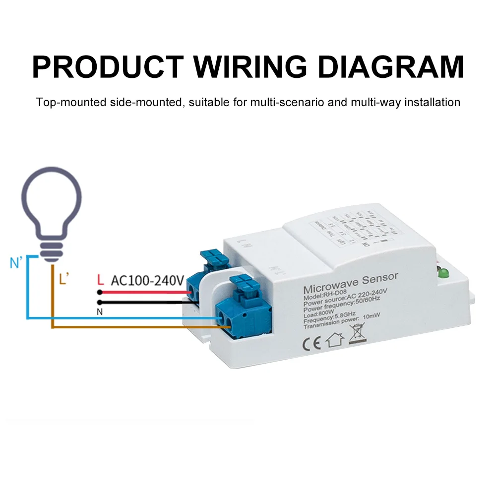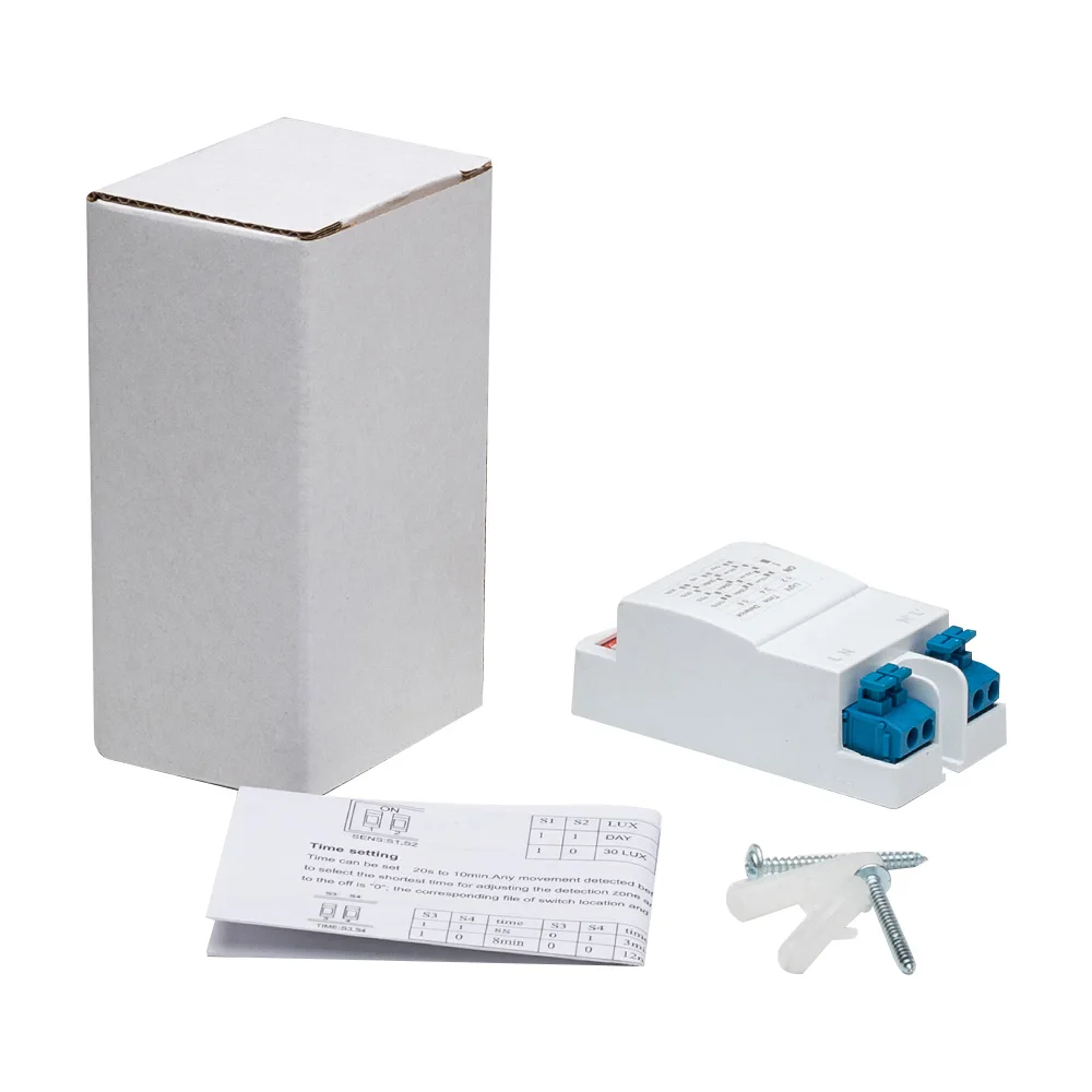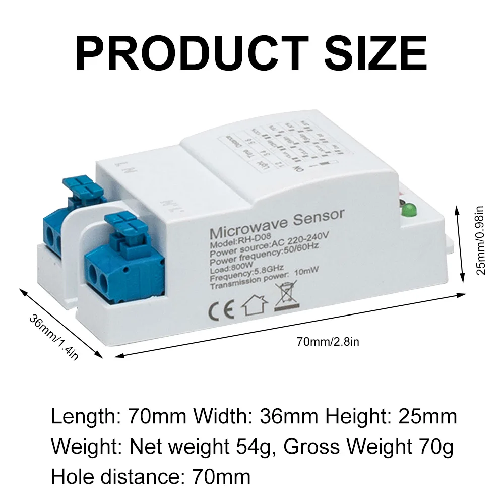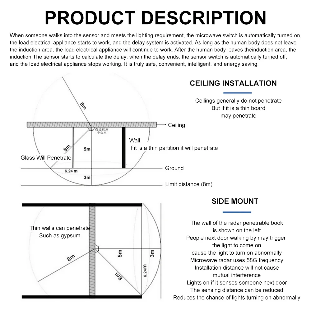 Product selling point1:360° induction without blind zone2: Multiple adjustment settings3: Fire retardant material4: High sensitivity5: Press-type terminal blocks are easy and quick to install.Product name: 5.8G radarProduct color: whiteWorking voltage: AC220-240VDetection angle: 360°Working temperature: -10~+40°CDetection distance: 8 meters radius (Max)Working frequency: 50/60HzAmbient light: <50LUXDelay time: 8 seconds-12 minutes (adjustable)Installation height: 2.5-3.5MRated load: 200W LED