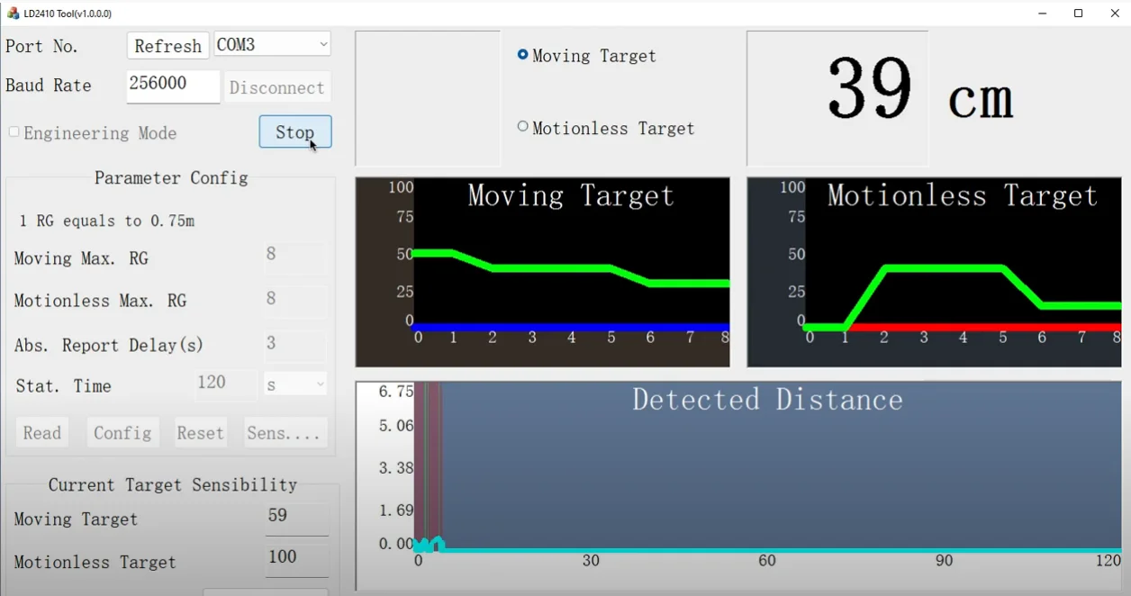 In order to facilitate the user to test and configure the module quickly and efficiently, a PC configuration tool is provided. The user can use this tool software to connect the serial port of the module, read and configure the parameters of the module, and receive the detection results reported by the. module. Data, and real-time visual display, which greatly facilitates .the use of users.