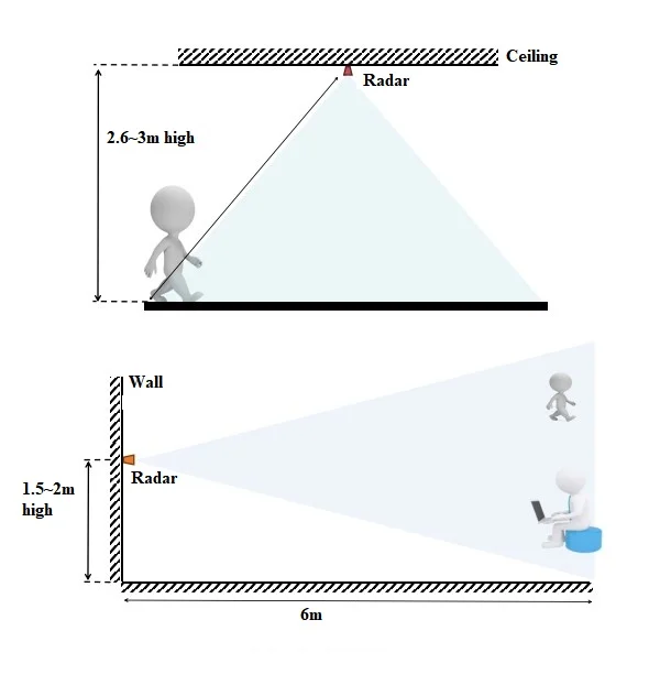 This product is mainly used in indoor scenes to sense whether there is a moving or micro-moving human body in the area, and output the detection results in real time. Farthest sensing distance up to 6 meters, distance resolution 0.75m. Provides a visual configuration tool, which can easily configure the sensing distance range and sensing in different intervals sensitivity and unmanned delay time, etc., to adapt to different specific application needs.