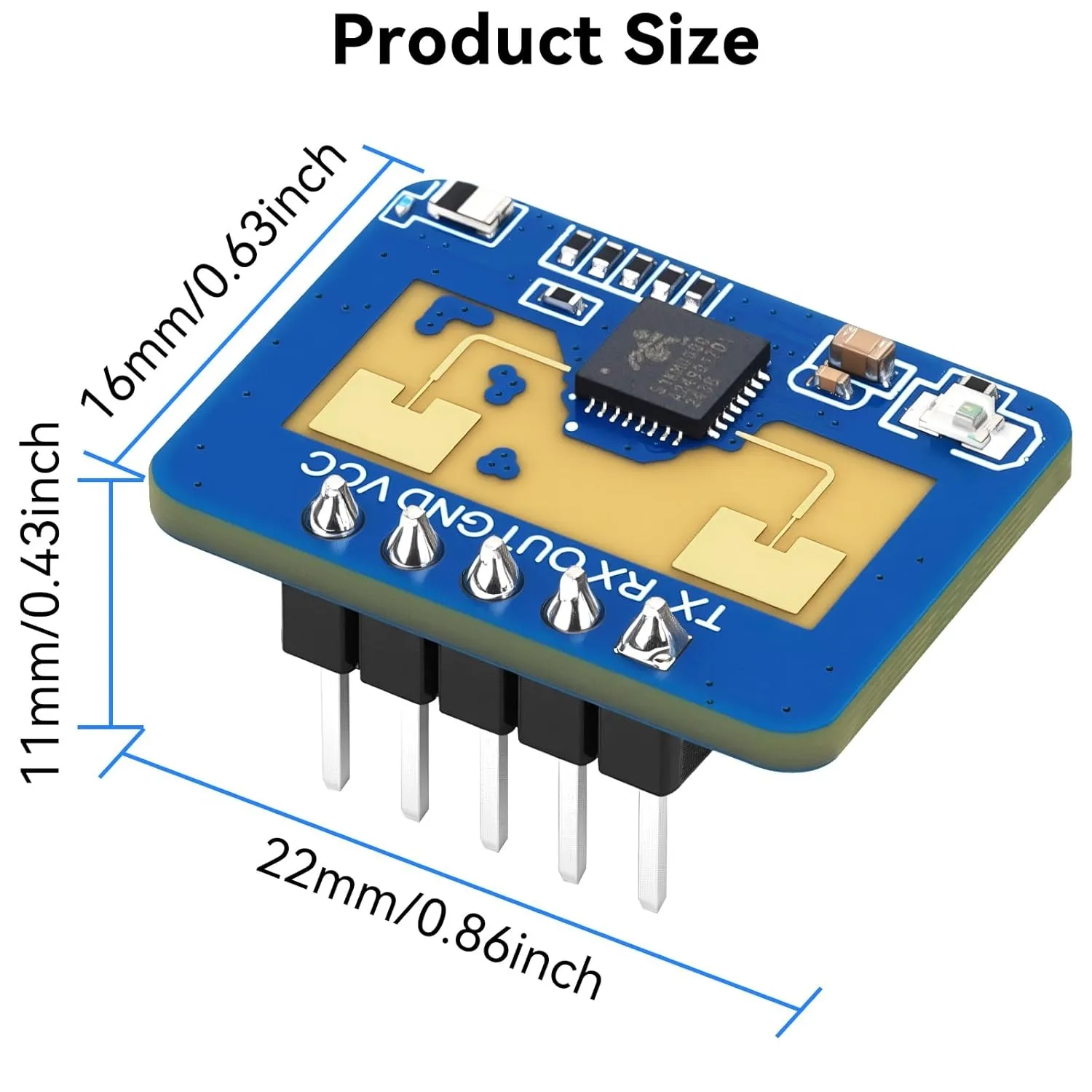 Module size: 16mmx22mm, with 5 pin holes reserved for hardware (factory default pin)