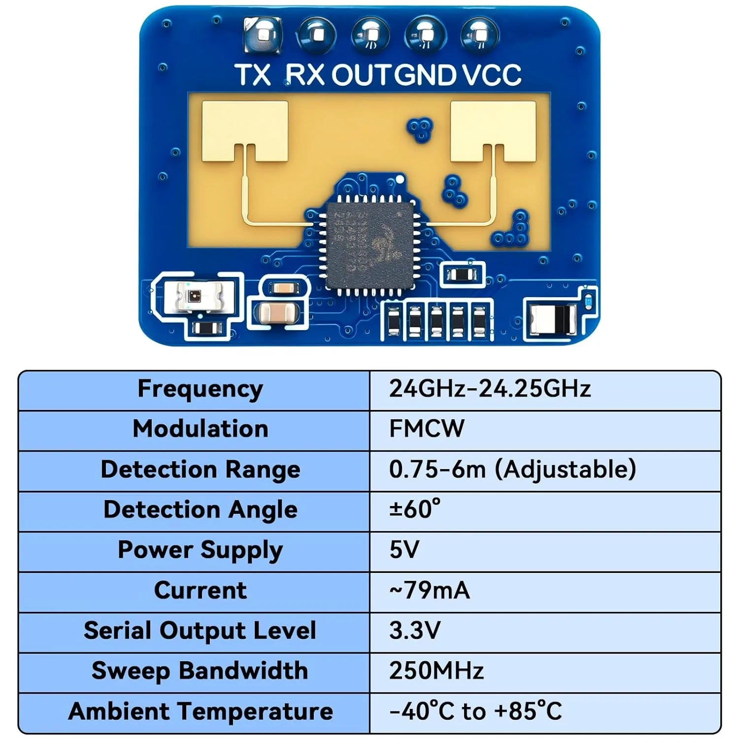 LD2410 Human Presence Radar Sensor ModuleProduct characteristicsFrequency: 24GHz~24.25GHzModulation mode: FMCWDetection distance: 0.75m~6m adjustableDetection angle: ± 60°Power supply: 5VCurrent: 79mAOutput serial port level: 3.3VSweep bandwidth: 250MHzRange resolution 0.75mAmbient temperature: - 40℃~+85℃Data format: serial port ASCII output/high and low level 3.3V&0VModule size: 16mmx22mm, with 5 pin holes reserved for hardware (factory default pin)The hole diameter of pin hole is 0.9mm, an