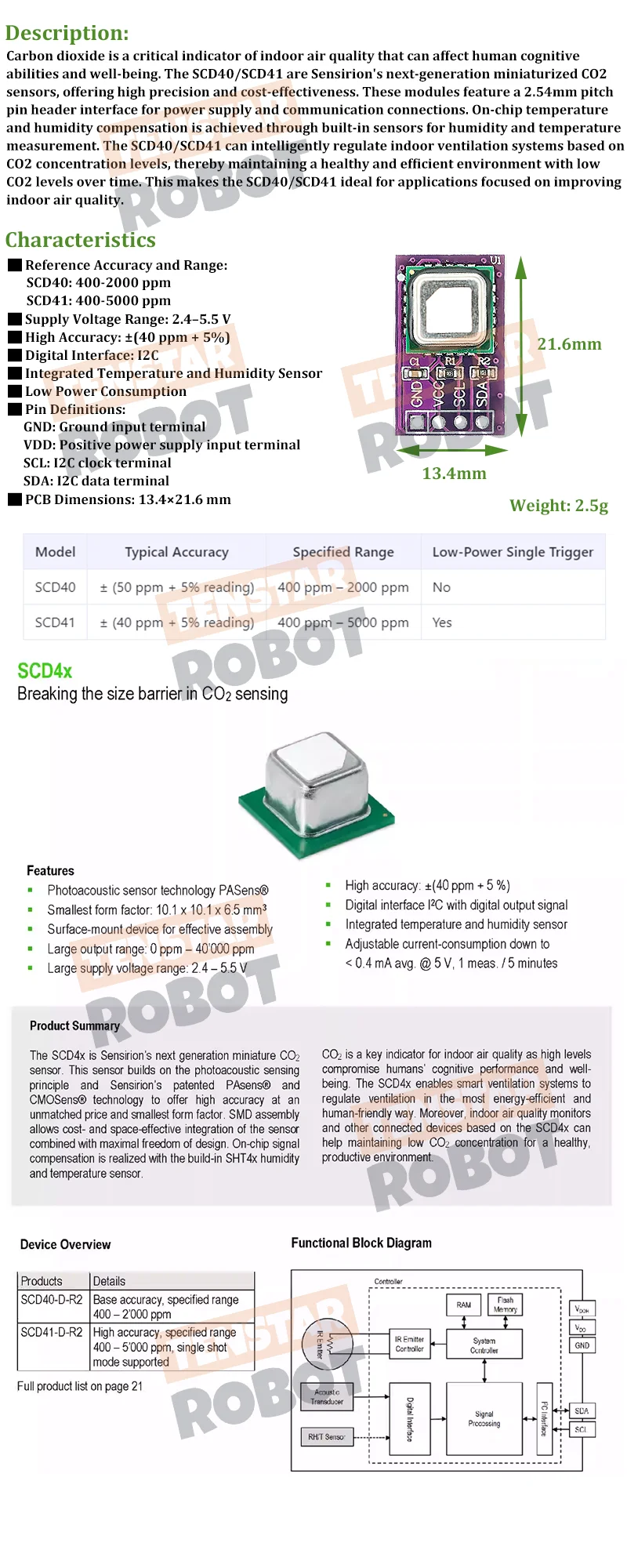 Tenstar SCD40 SCD41 Gas Sensor Module 2.4-5.5V Detects CO2 Carbon Dioxide Temperature and Humidity Sensor I2C Communication