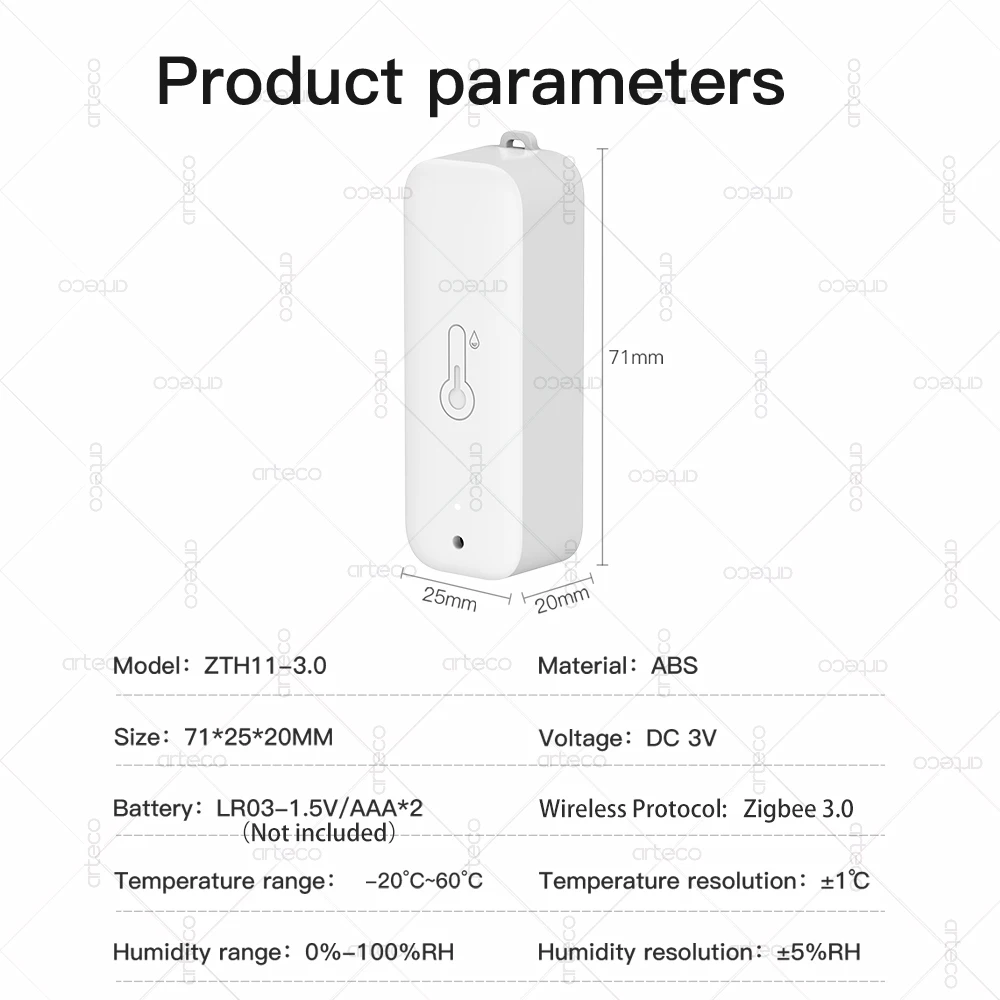 Product name : Zigbee temperature & humidity sensorWireless Protocol: Zigbee 3.0Waterproof rate: IP65Voltage: DC 3VBattery: LR03-1.5V/AAA*2(Not included)Material: ABSTemperature range: -20C~60CTemperature resolution: ±1°CHumidity range: 0%-100%RHHumidity resolution: 5%RHSize:71*25*20MM*How to use this product ?Answer: Please use it with one zigbee gateway . It cannot work alone without zigbee gateway.*How is the temperature and humidity display on app ?Answer :If using Tuya Zigbee gateway, t