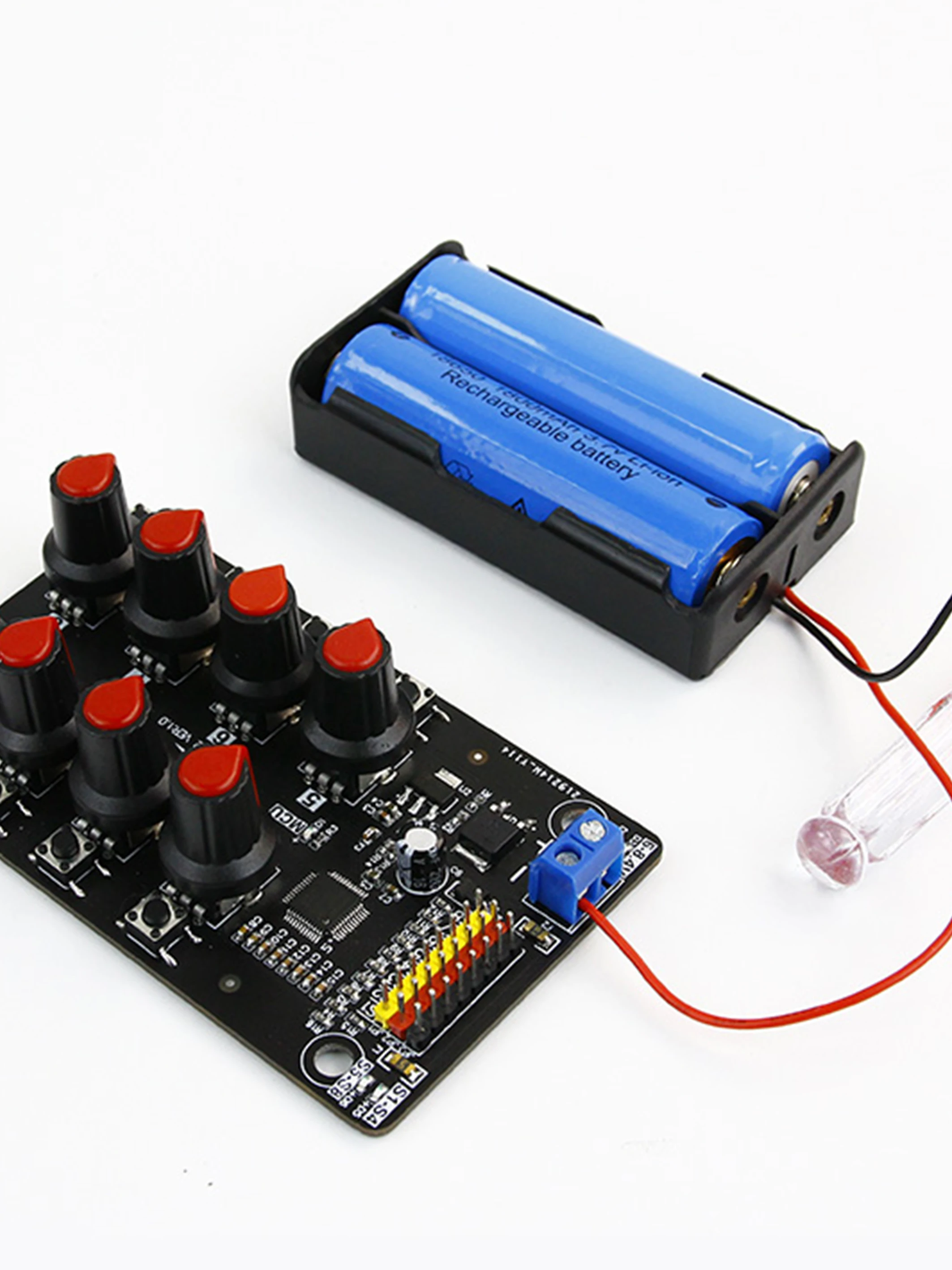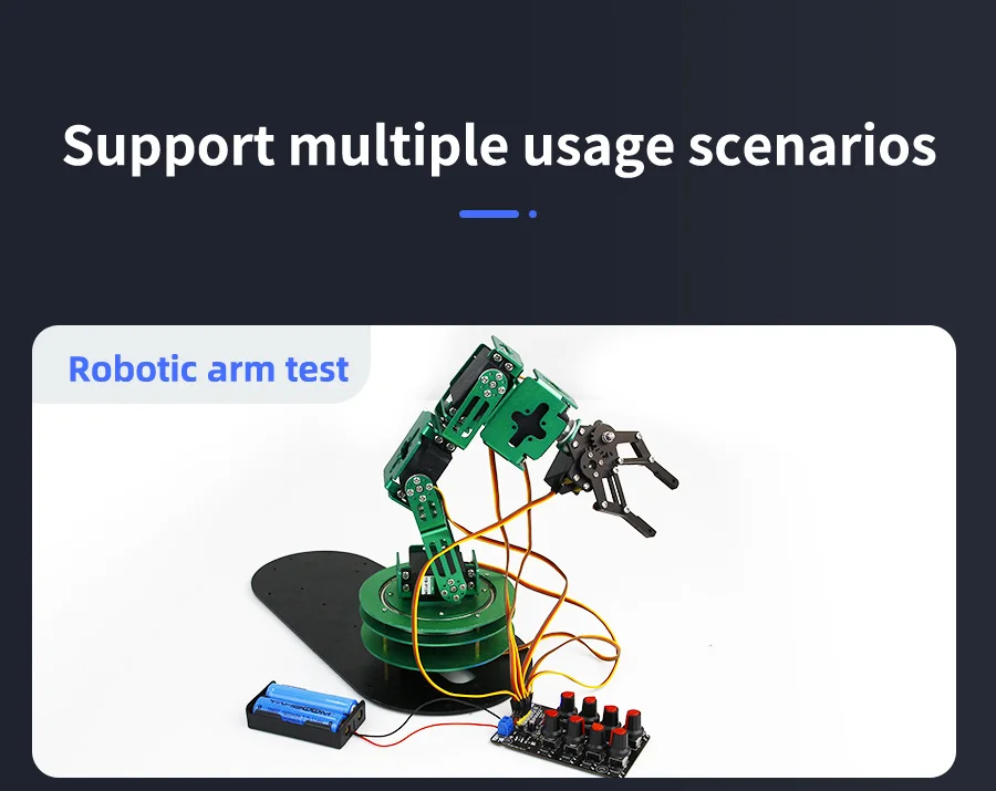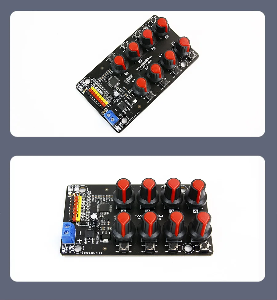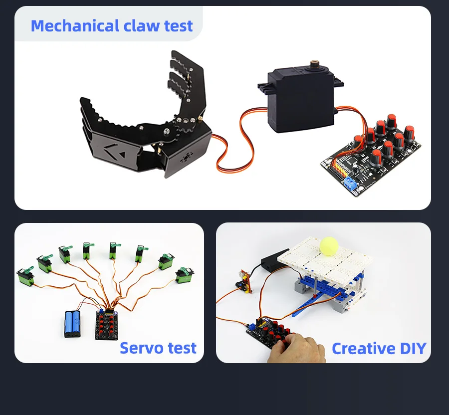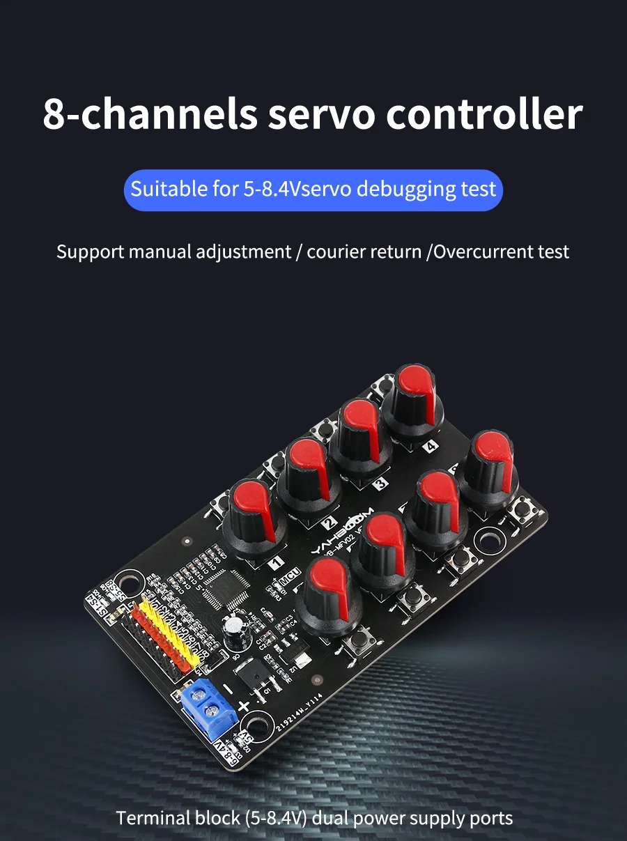 8-Channel PWM Servo Control Debugging Board for Smart Robotic Arm DIY Electronic Kit Equipped with High-precision Potentiometer Over-Current Protection 100% brand new and high qualityDescriptionThis driver debugging board has 8-channel independent servo interface, which can be used to debug 5V~8.4V servo. Equipped with STC8G2K64S4 chip and high-precision potentiometer. No need any codes, after connecting to the power supply, the servo can be controlled by the on-board adjustable knobs or buttons